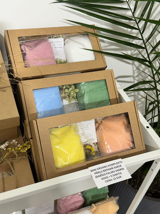 Pērļu sveču dāvanu komplekts ar trauciņu pasteļtoņos