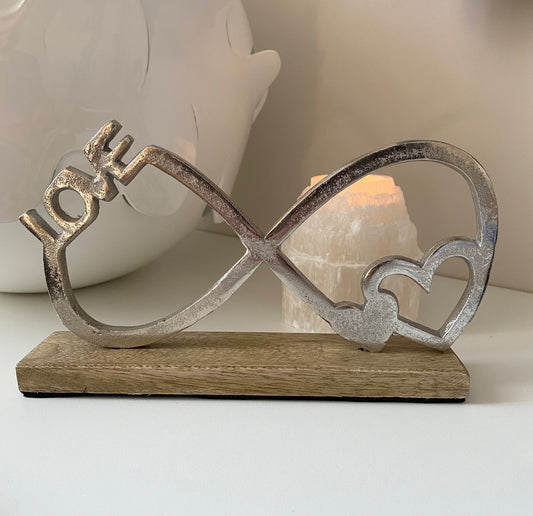 Metāla bezgalības simbola skulptūra ar mango koka pamatni, 14,5x24cm