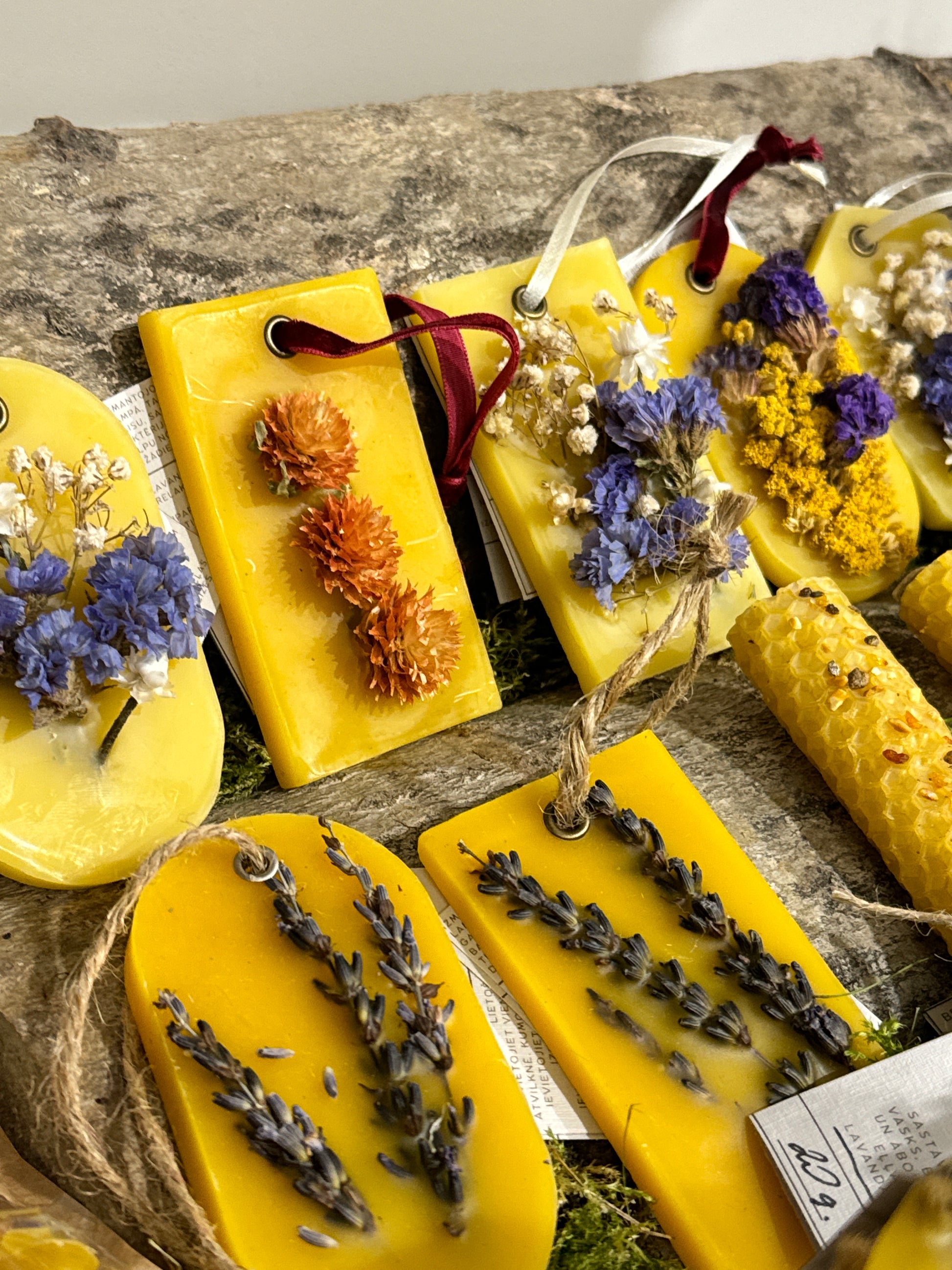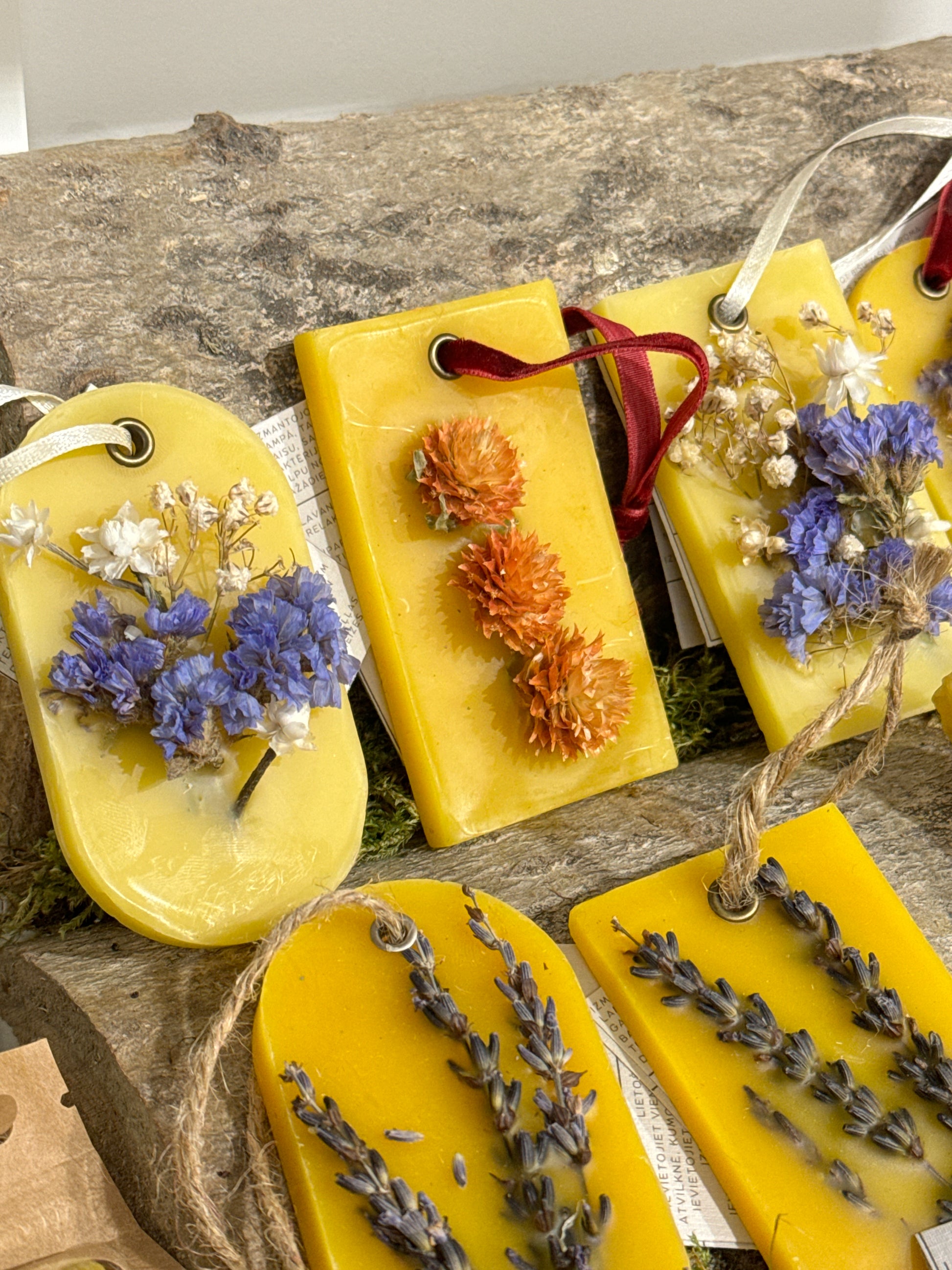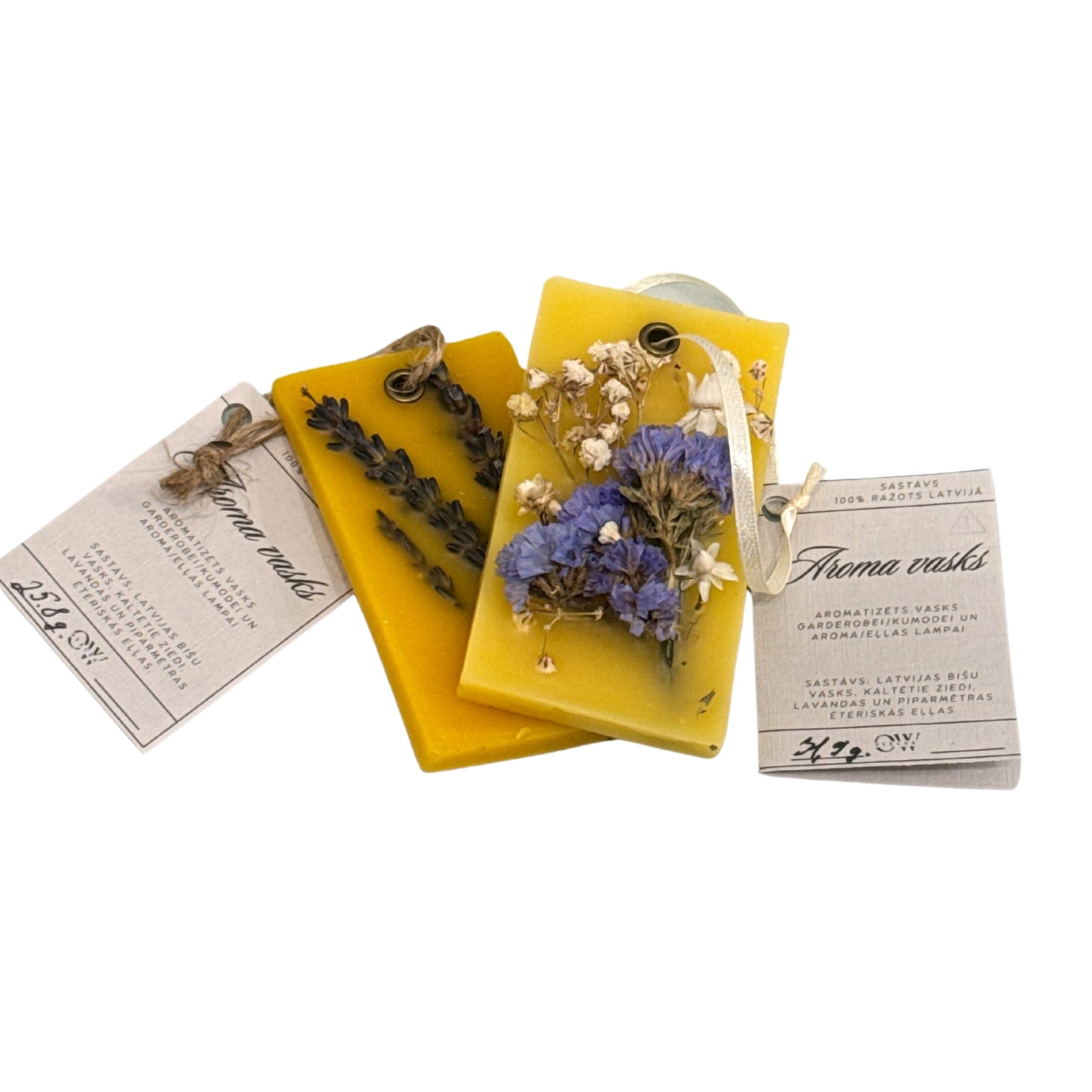 - Aroma vasks ir izgatavots no 100% Bišu vaska, kas patīkami smaržo, pēc medus un propolisa ar Lavandas ēterisko eļļu, kas efektīvi atbaida kodes un maigi atsvaidzina apģērbu drēbju skapī. Kā eleganta niansīte ir kaltētais Lavandas ziediņš.