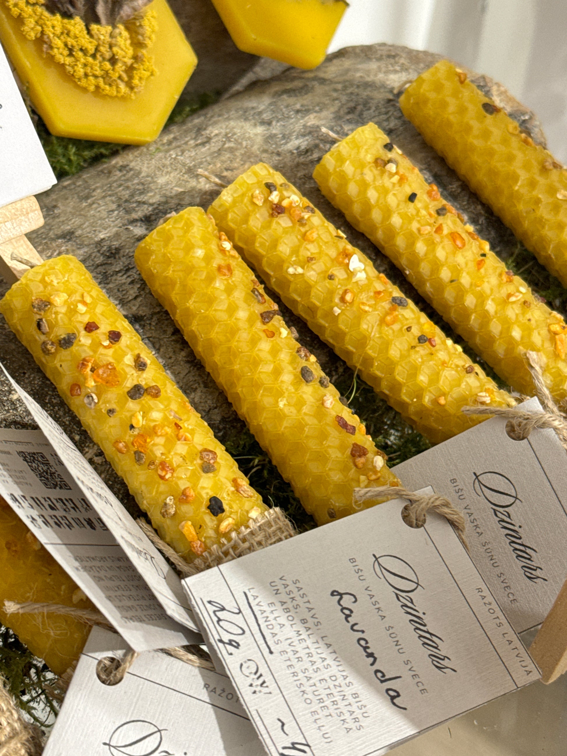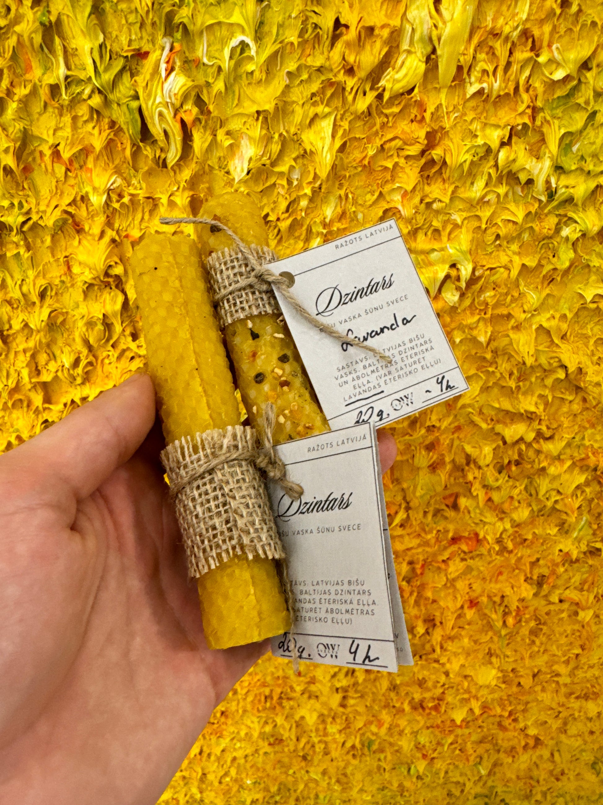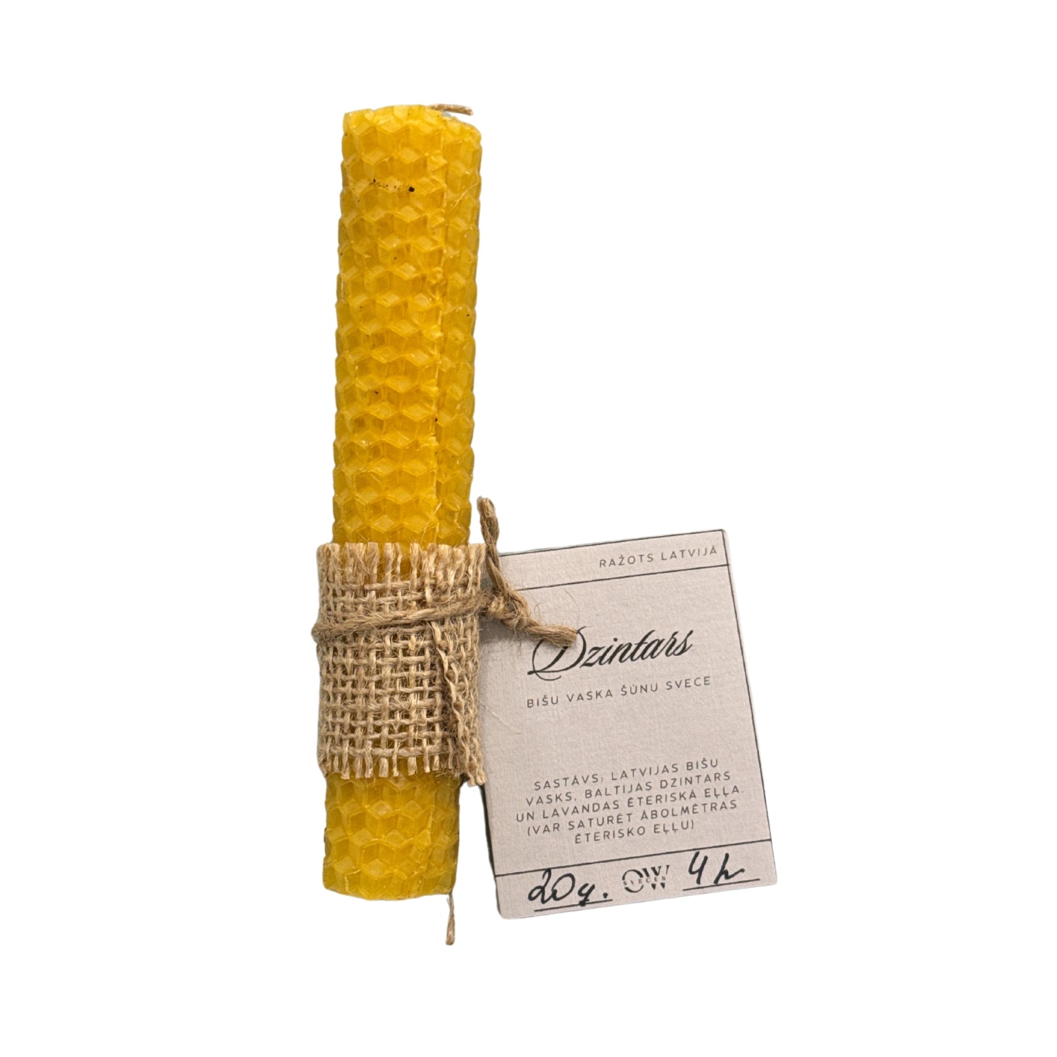 - Ar roku siltumu tīta Bišu vaska šūnu svece ar Dzintaru, Ābolmētras ēterisko eļļu un kaņepes degli, kas degot nedūmo.