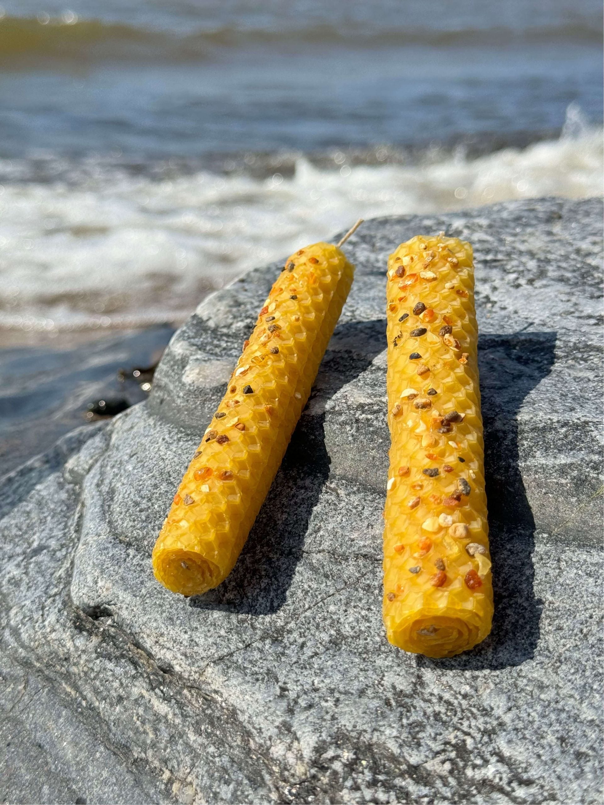- Bišu vaska šūnu svece no vienas puses ir izrotāta ar vertikālu strīpu no dažādu krāsu Baltijas Dzintara akmeņiem (balts, melns, zelta, dzeltens, brūns,u.c.). Degot svecei dzintara gabaliņi vienkārši nokritīs uz svečtura vai iekritīs sveces izveidotā, tā saucamā, vaska baseinā.Zaigmojošie zelta, baltie, melnie un brūnie Dzintara “kristāli”, kas būtībā ir pārakmeņojušies koku sveķi, kas jau tūkstošiem gadu tiek izmantoti dziedināšanai. Dzintars attīra auru un telpu no negatīvās enerģijas. Dzintars ir spēdzīgs iedvesmas avots, tas piesaista saules enerģiju un nes veiksmi, dziedina un atjauno nervu sistēmu.