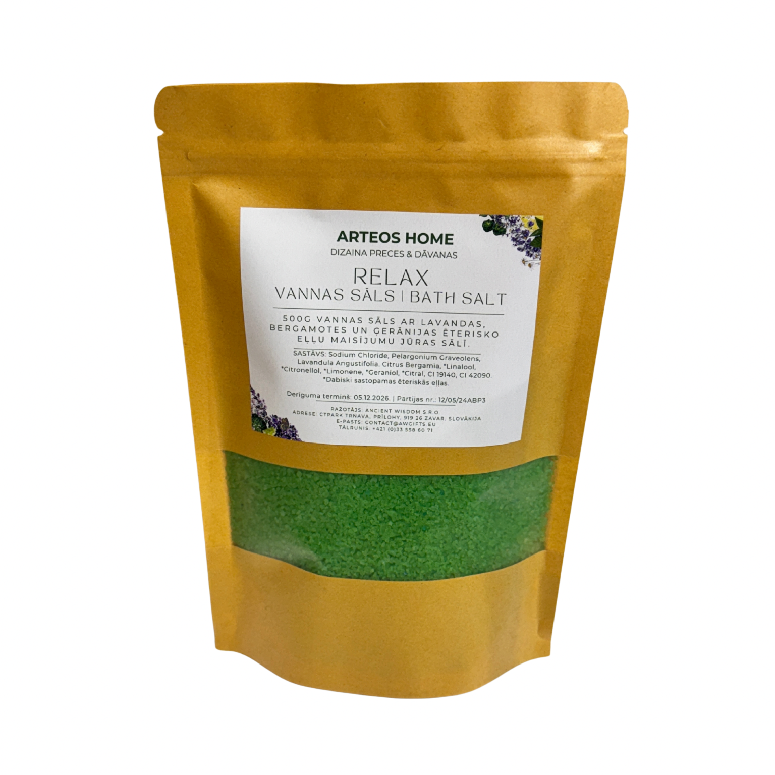 - Nomierini prātu un ķermeni ar aromterapijas vannas sāli Relax, kas radīts no dabīga jūras sāls un harmoniska ģerānijas, lavandas un bergamotes ēterisko eļļu maisījuma. Šī dabiskā kompozīcija palīdz atslābināties, līdzsvarot emocijas un veicina mierīgu, dziļu relaksāciju pēc saspringtas dienas. Ideāls sabiedrotais vakara rituālos vai, kad vien nepieciešams atgūt iekšējo mieru.