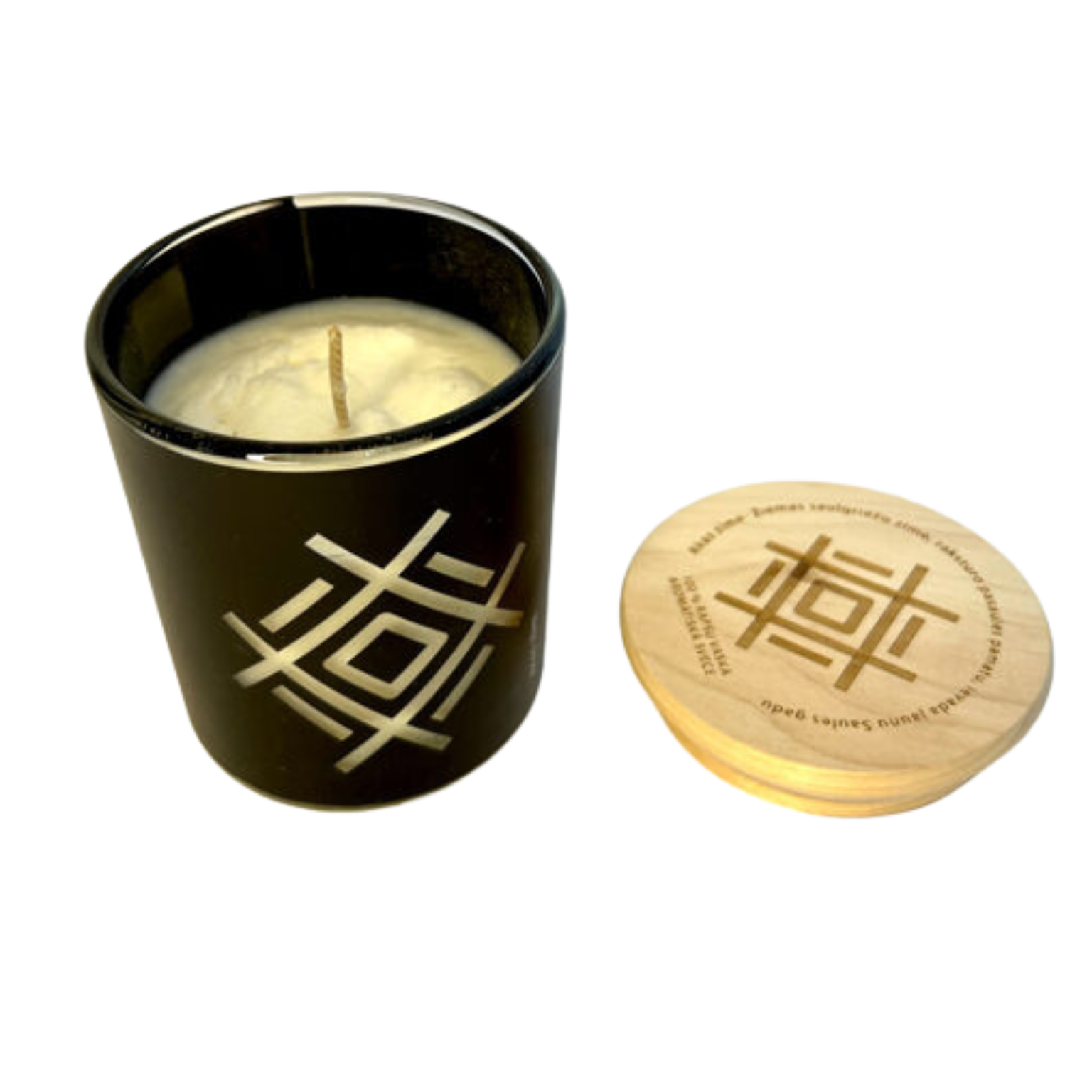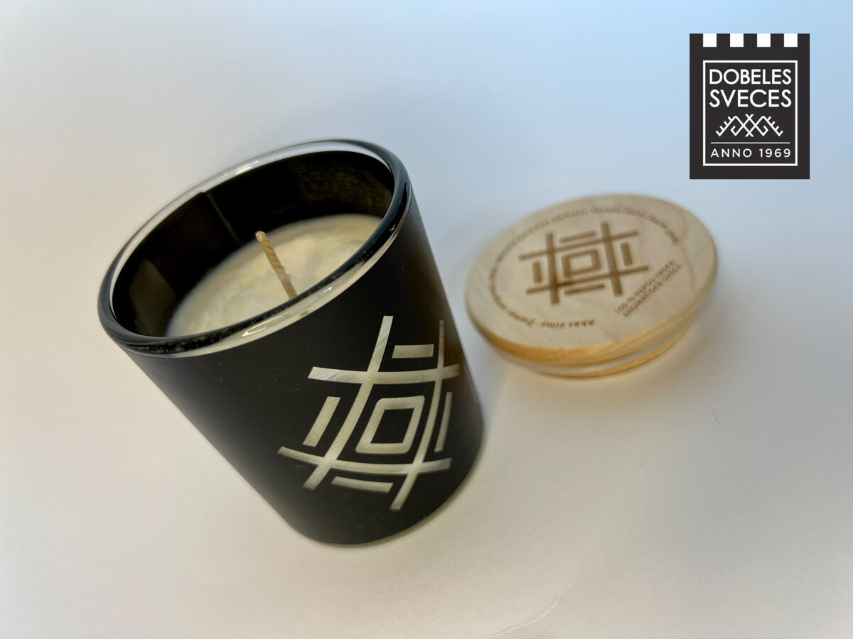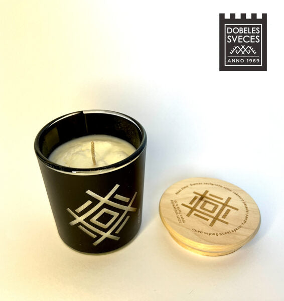 - 100% rapša vaska svece stikla glāzē 74 x 83 mm, 0,150 kg un īpašu dizaina jostu melnā krāsā ar “Akas zīmi”. Sveces liesmiņa zīmi īpaši izgaismo. Vetiver - vīrišķīgs, rūgtens aromāts + koka vāciņš ar gravējumu.