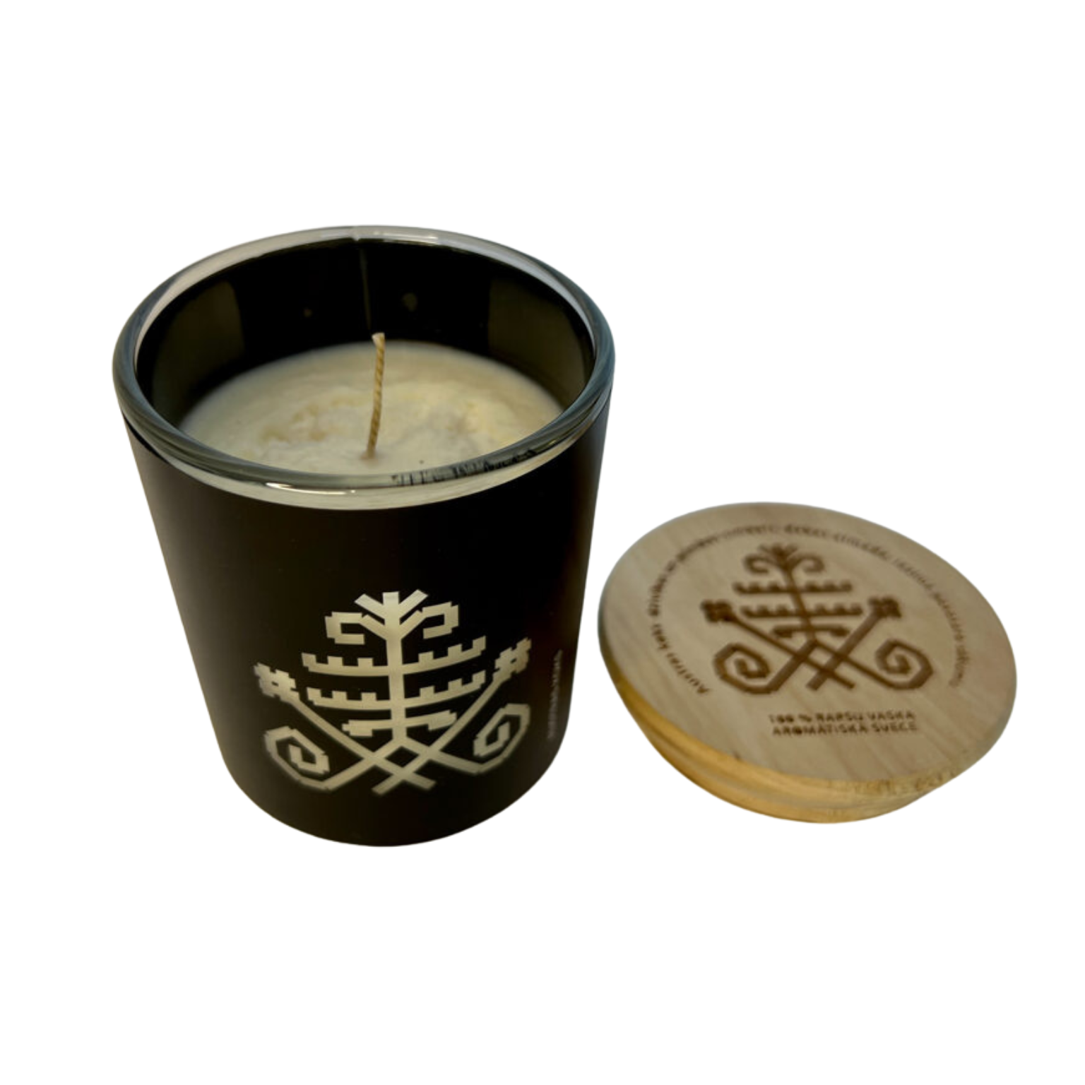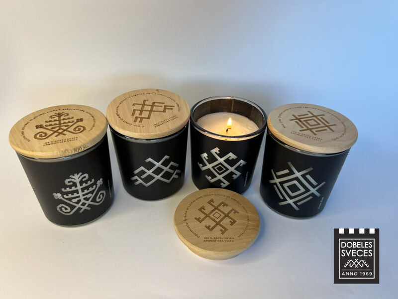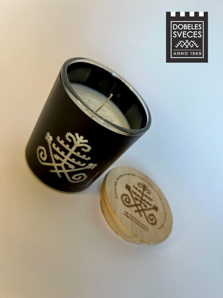 - 100% rapša vaska svece stikla glāzē 74 x 83 mm, 0,150 kg un īpašu dizaina jostu melnā krāsā ar zīmi "Austras koks". Sveces liesmiņa zīmi īpaši izgaismo. Luxe Linen aromāts + koka vāciņš ar gravējumu.