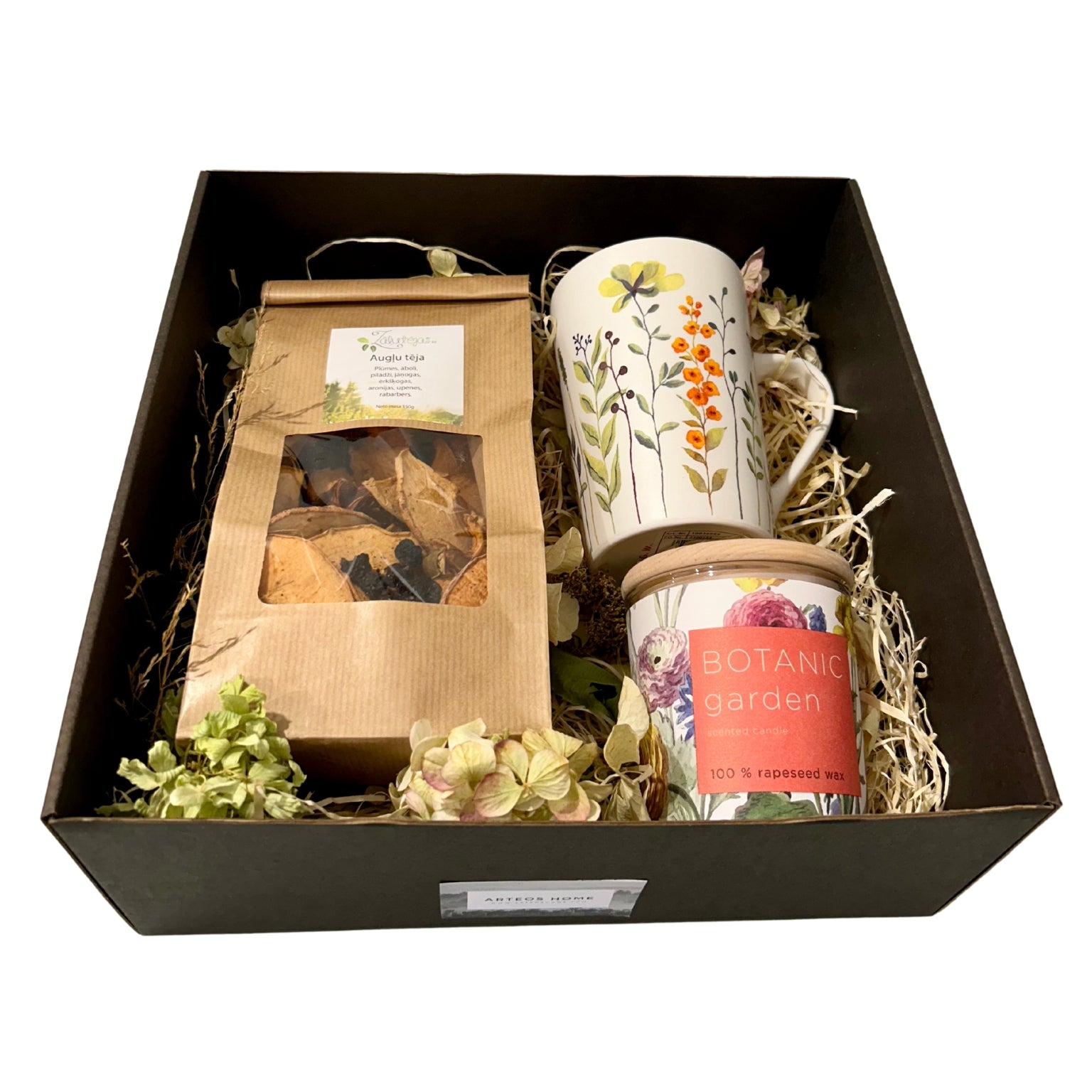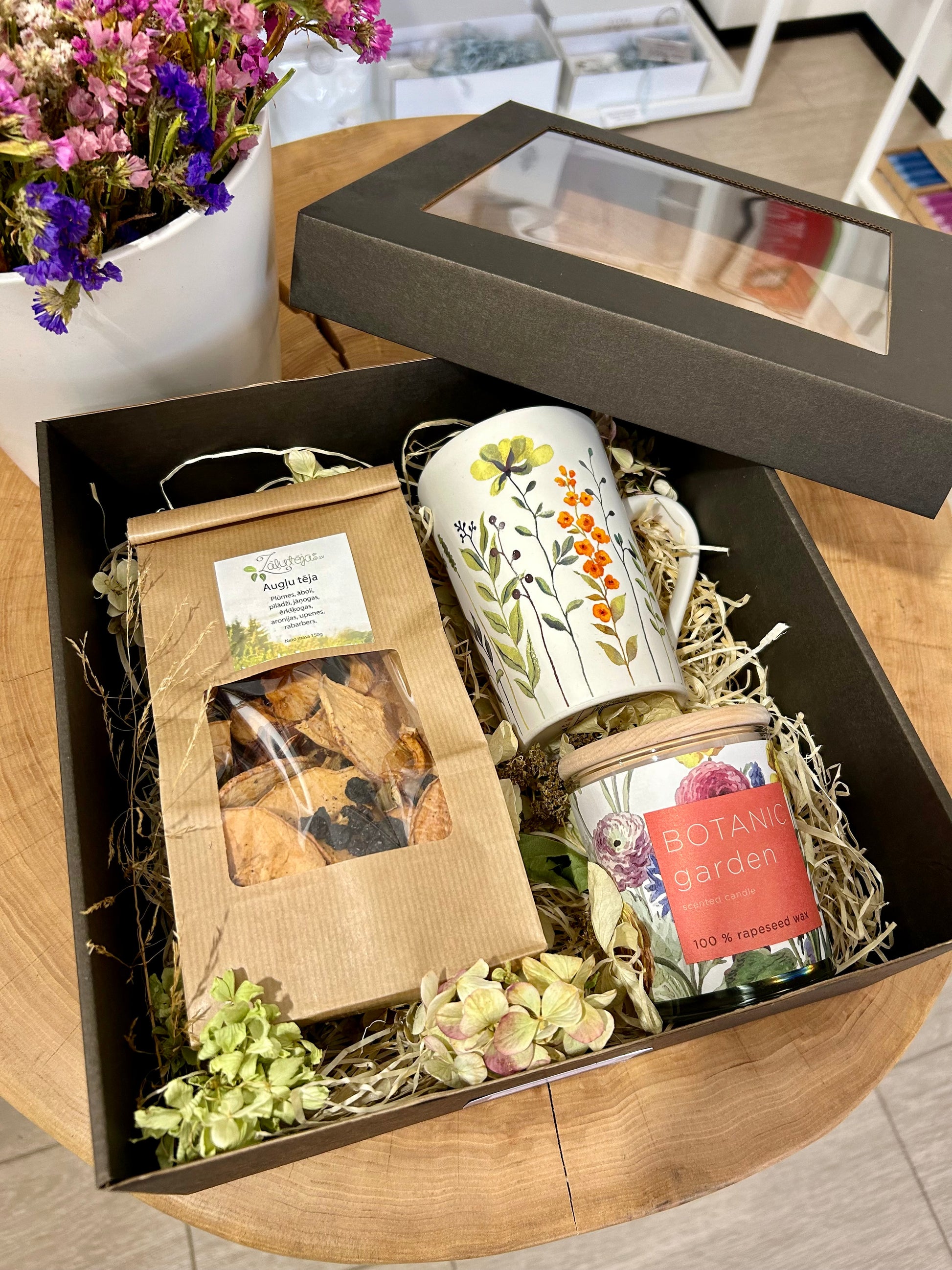 - Dāvana iesaiņota kastē ar sausajiem ziediem.