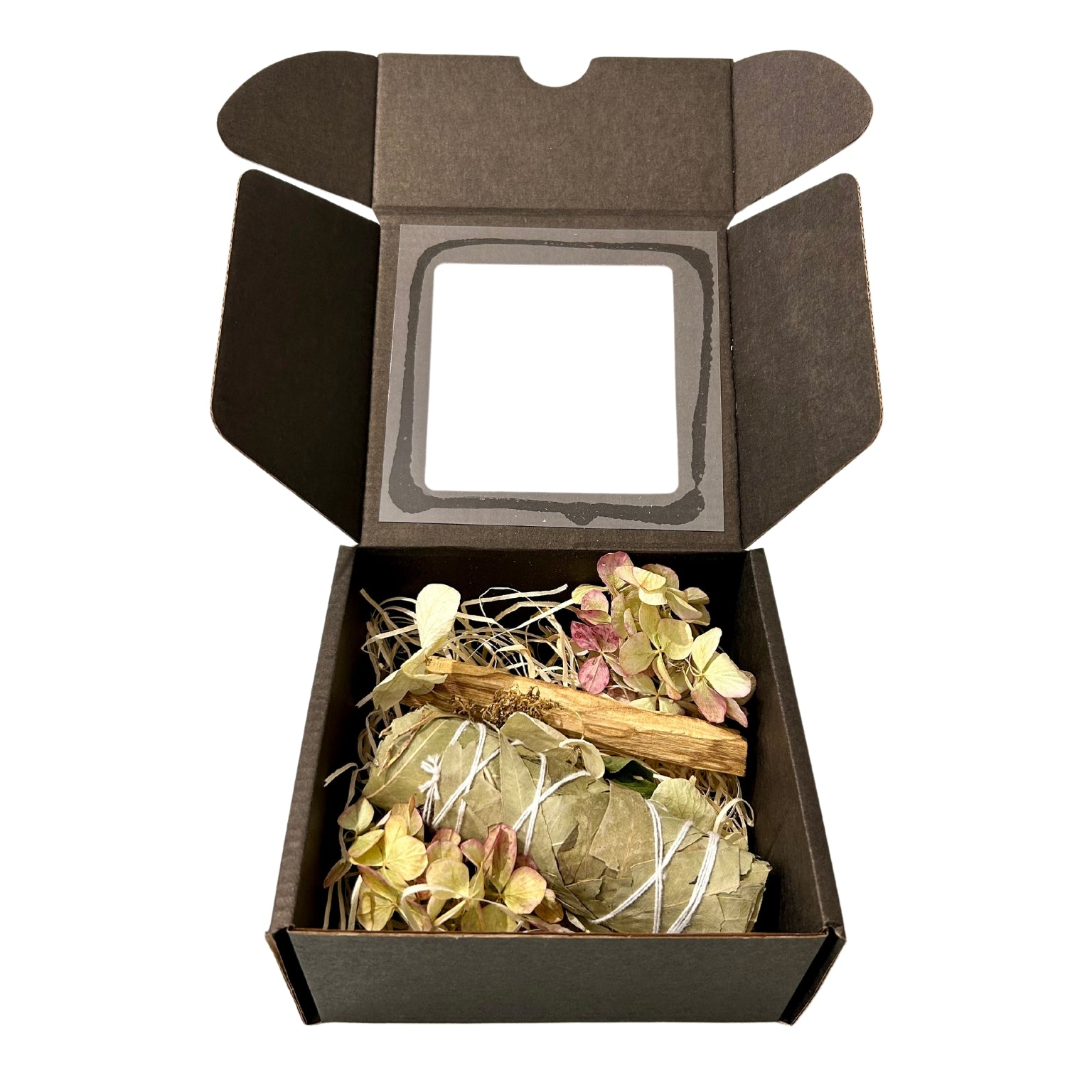 - Dāvana iesaiņota kastē ar sausajiem ziediem.