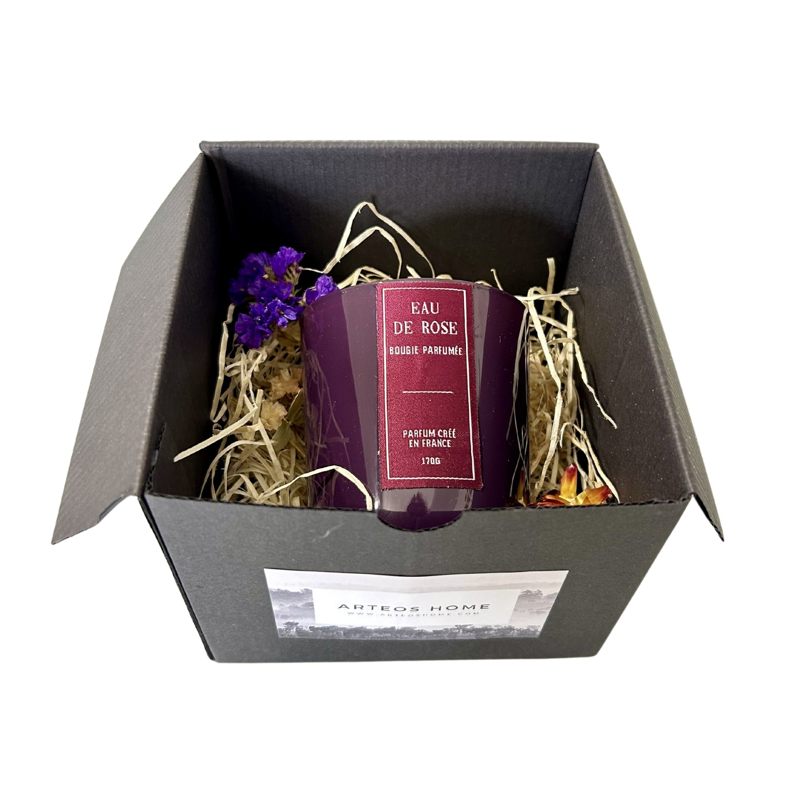 - Dāvana iesaiņota kastē ar sausajiem ziediem.