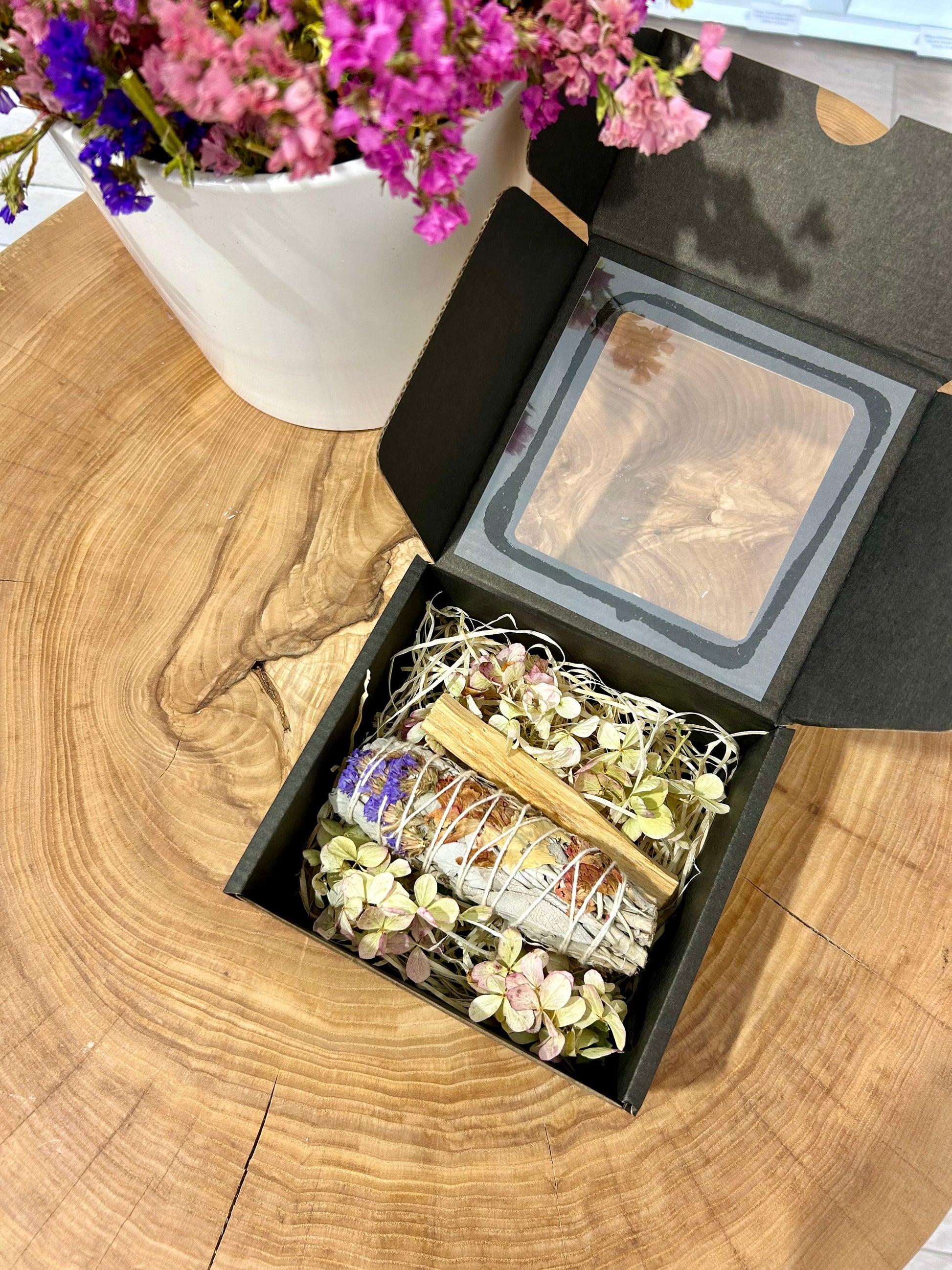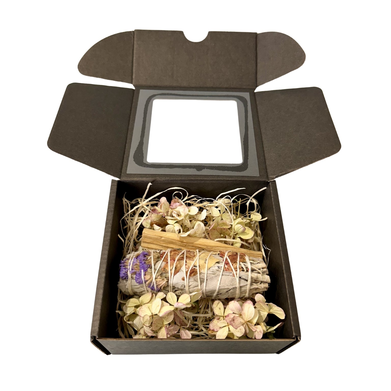 - Dāvana iesaiņota kastē ar sausajiem ziediem.