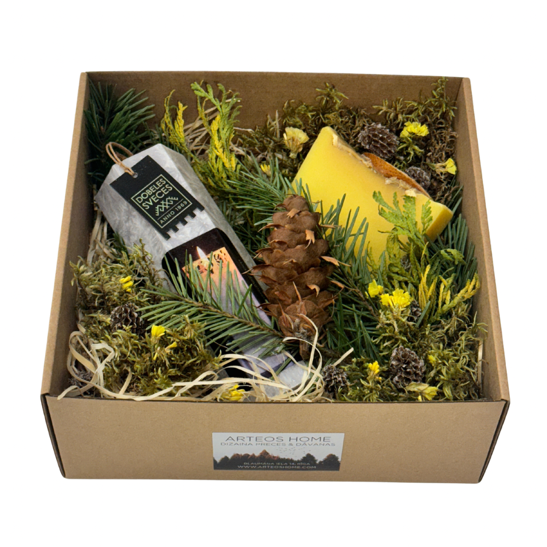 - Dāvanu komplekts dekorēts dāvanu kastē ar kaltētiem ziediem. Roku darbs.