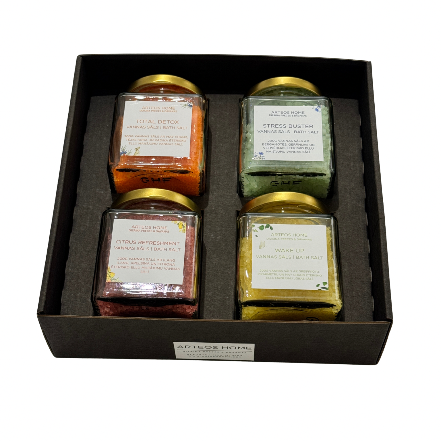 - Katrā stikla burciņā: 200g vannas sāls