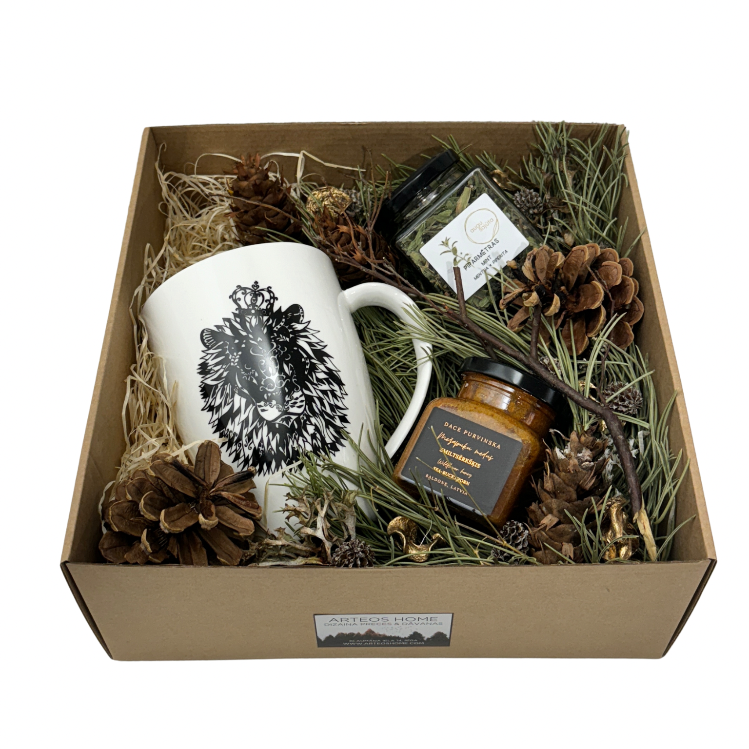 - Dāvanu komplekts dekorēts dāvanu kastē ar kaltētiem ziediem. Roku darbs.