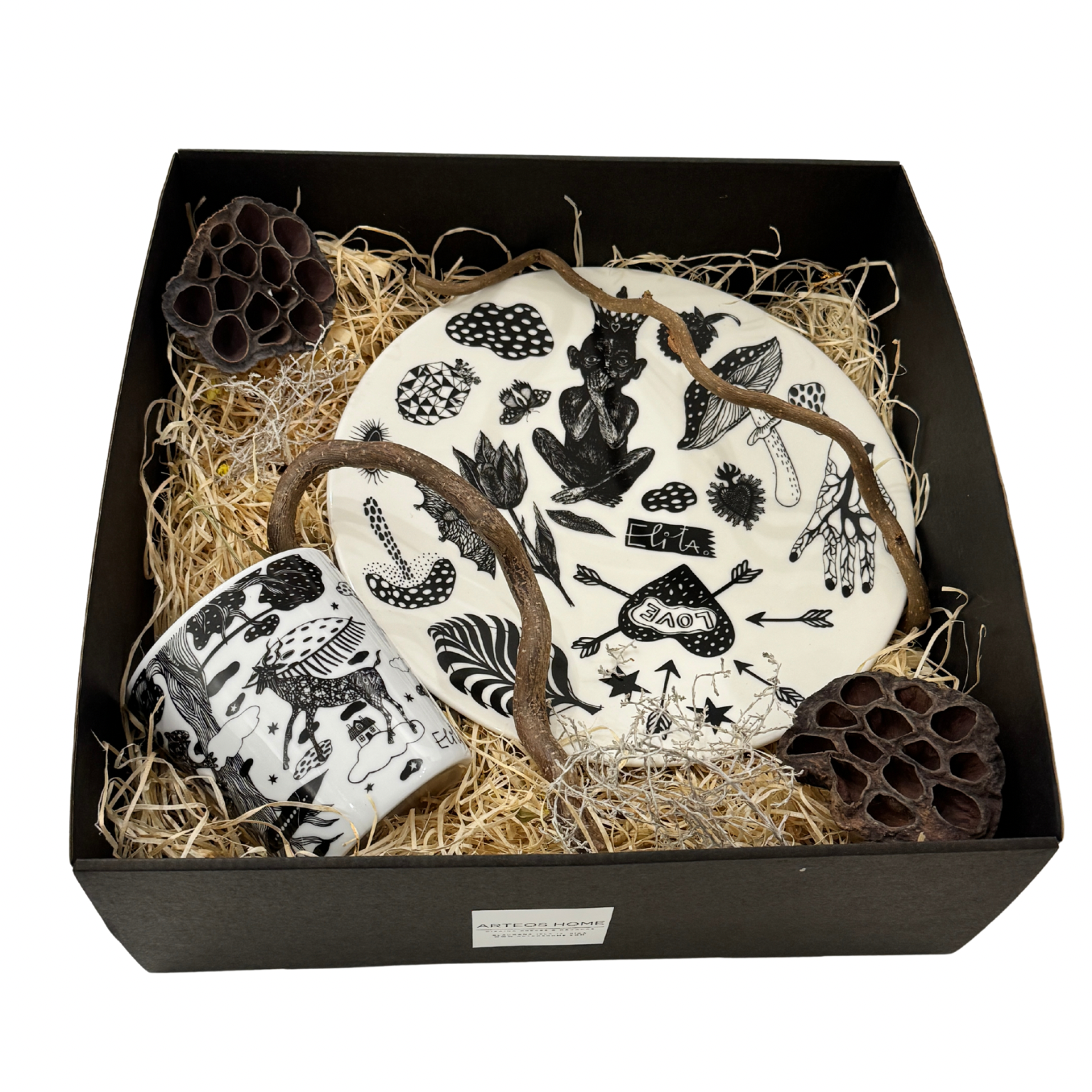 - Dāvanu komplekts dekorēts dāvanu kastē ar sausajiem ziediem un pa virsu uzsietu banti