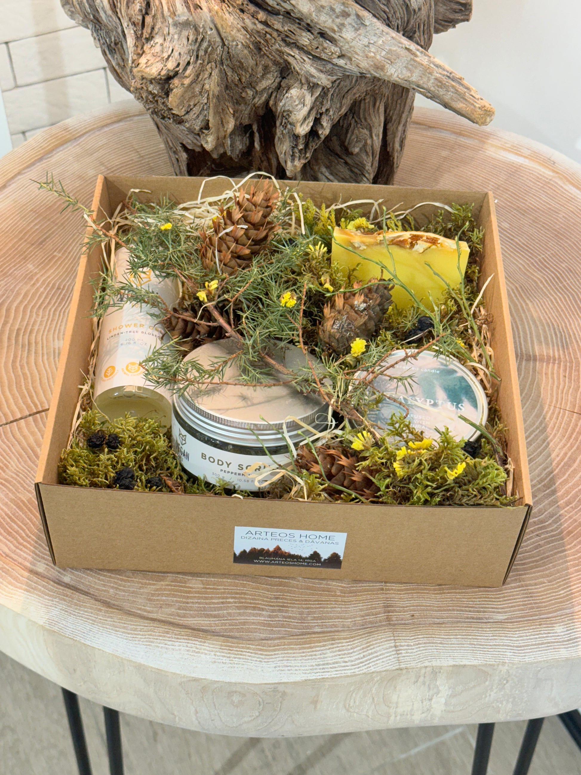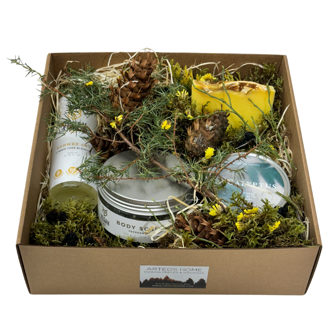 - Dāvanu komplekts dekorēts dāvanu kastē ar kaltētiem ziediem. Roku darbs.