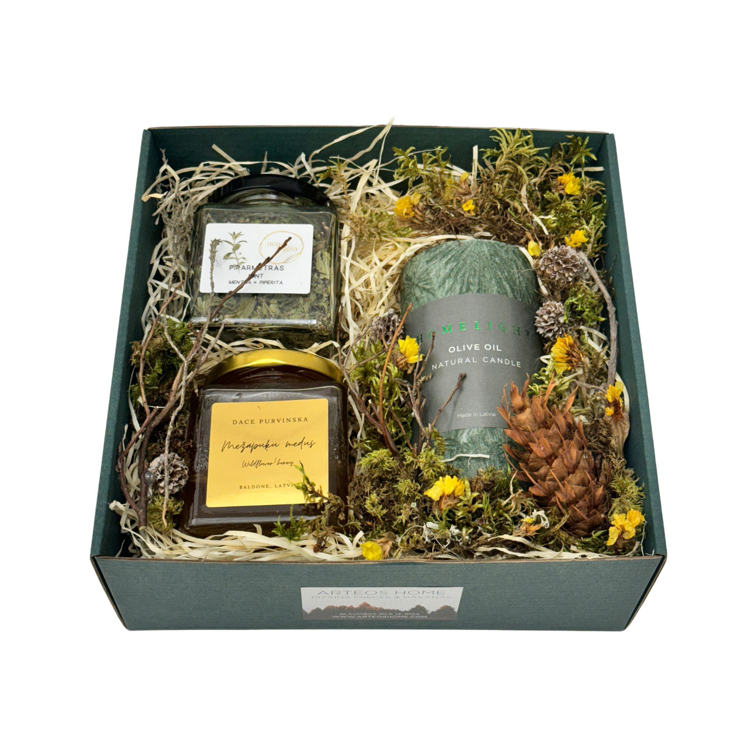 - Dāvanu komplekts noformēts dāvanu kastē un dekorēts ar sausajiem ziediem