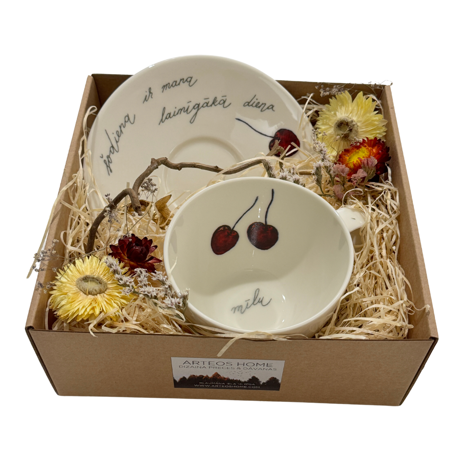 - Komplektā: Porcelāna kafijas tase ar apakštasi: Mīlu