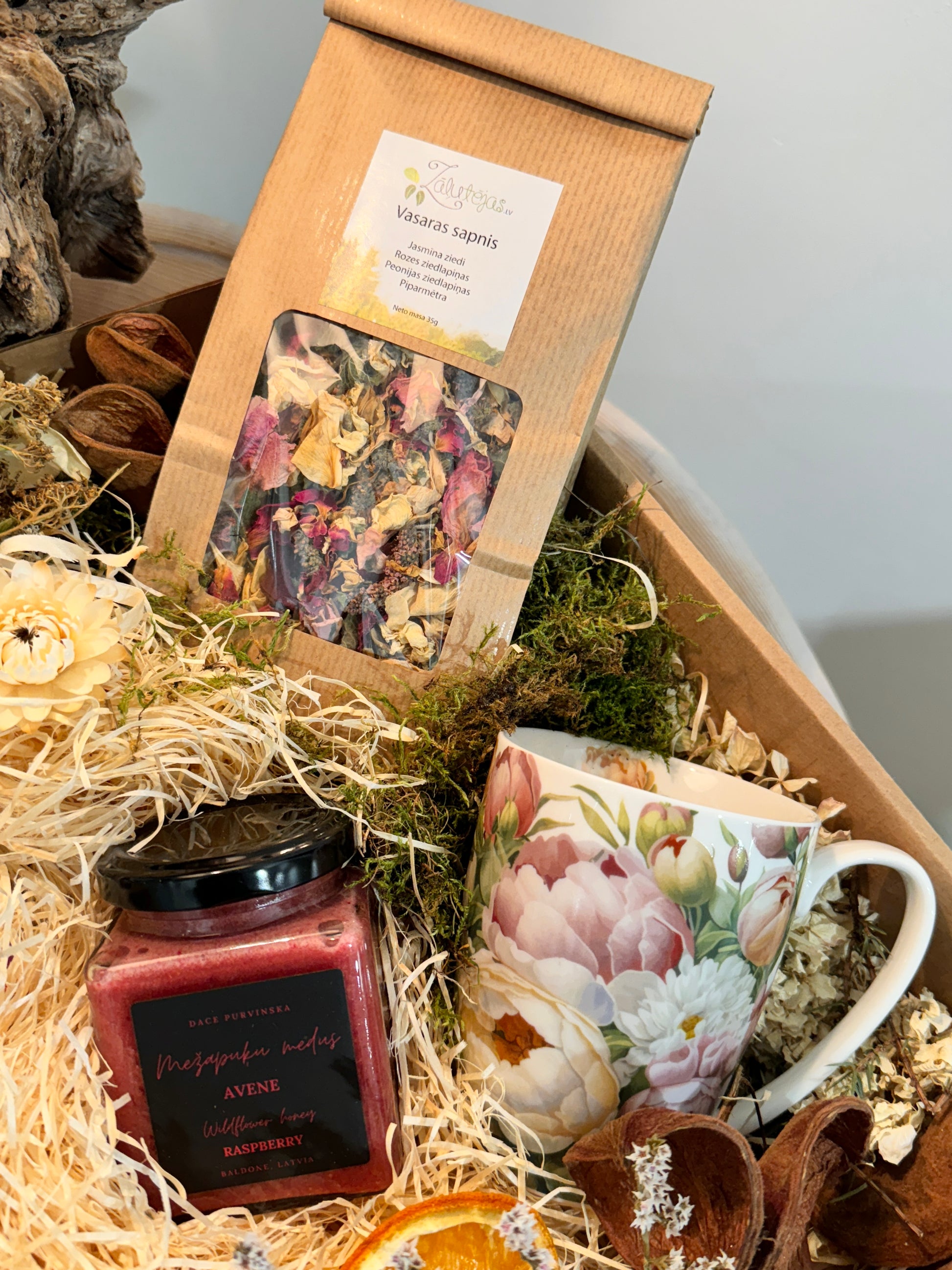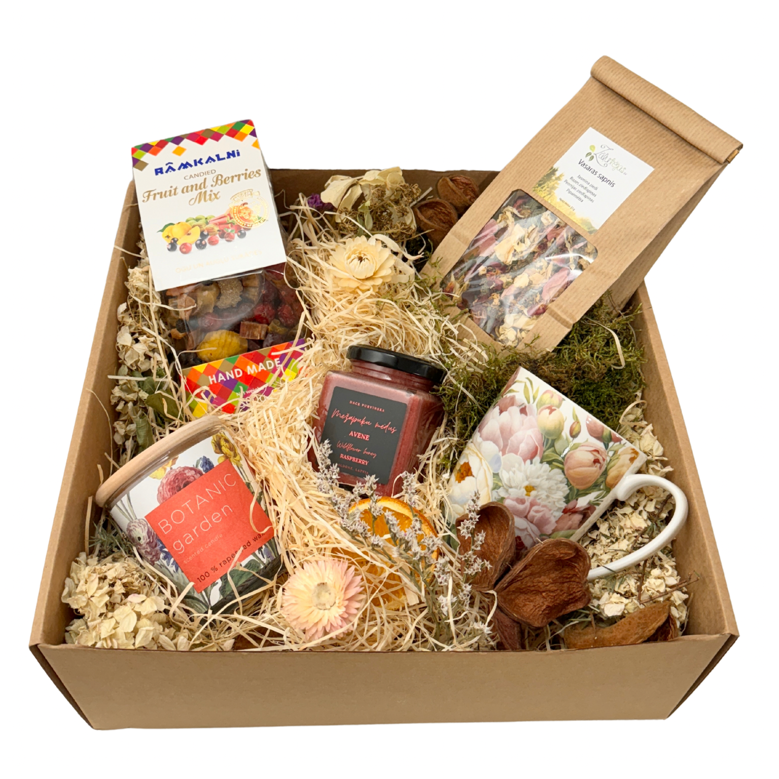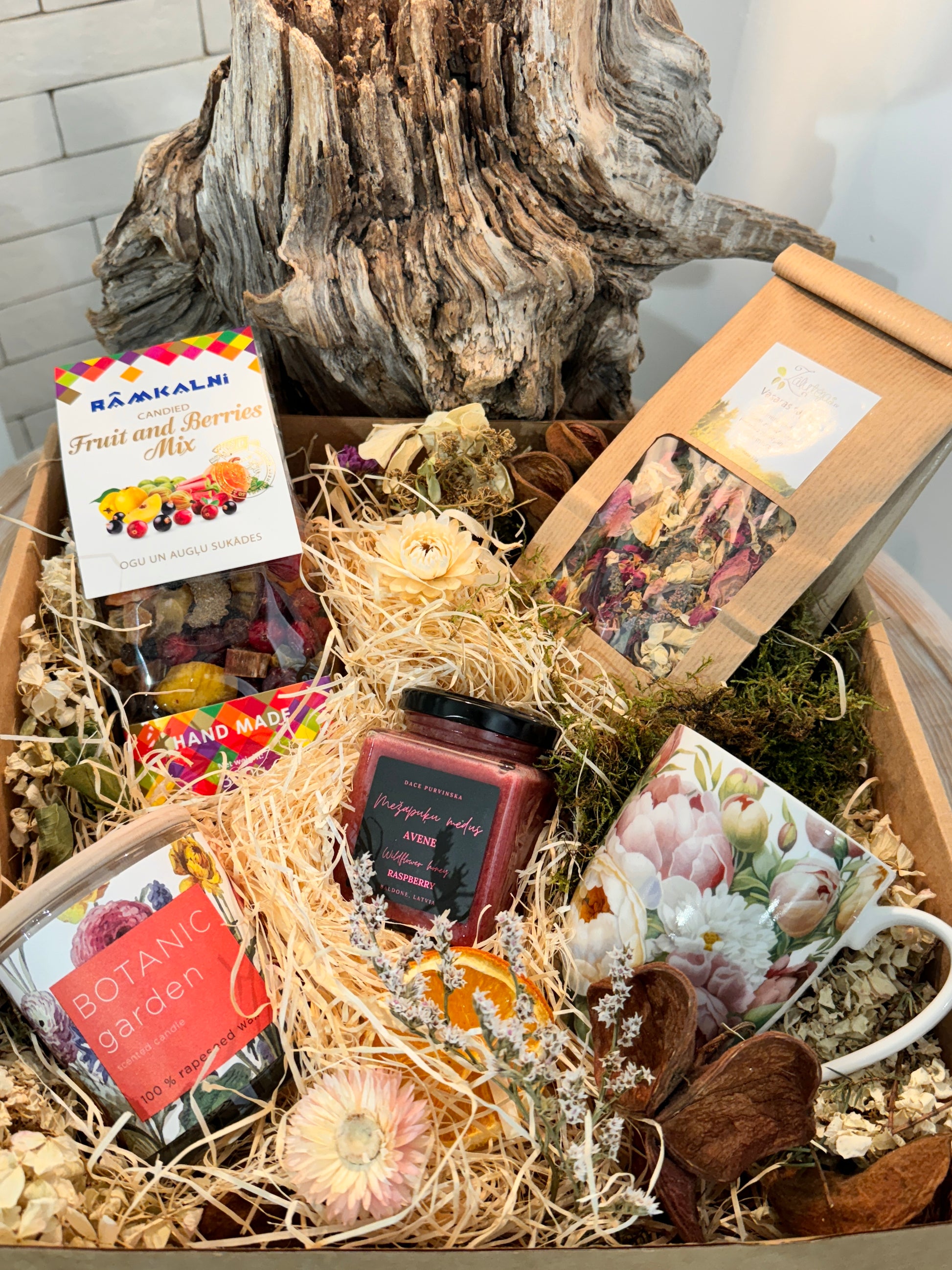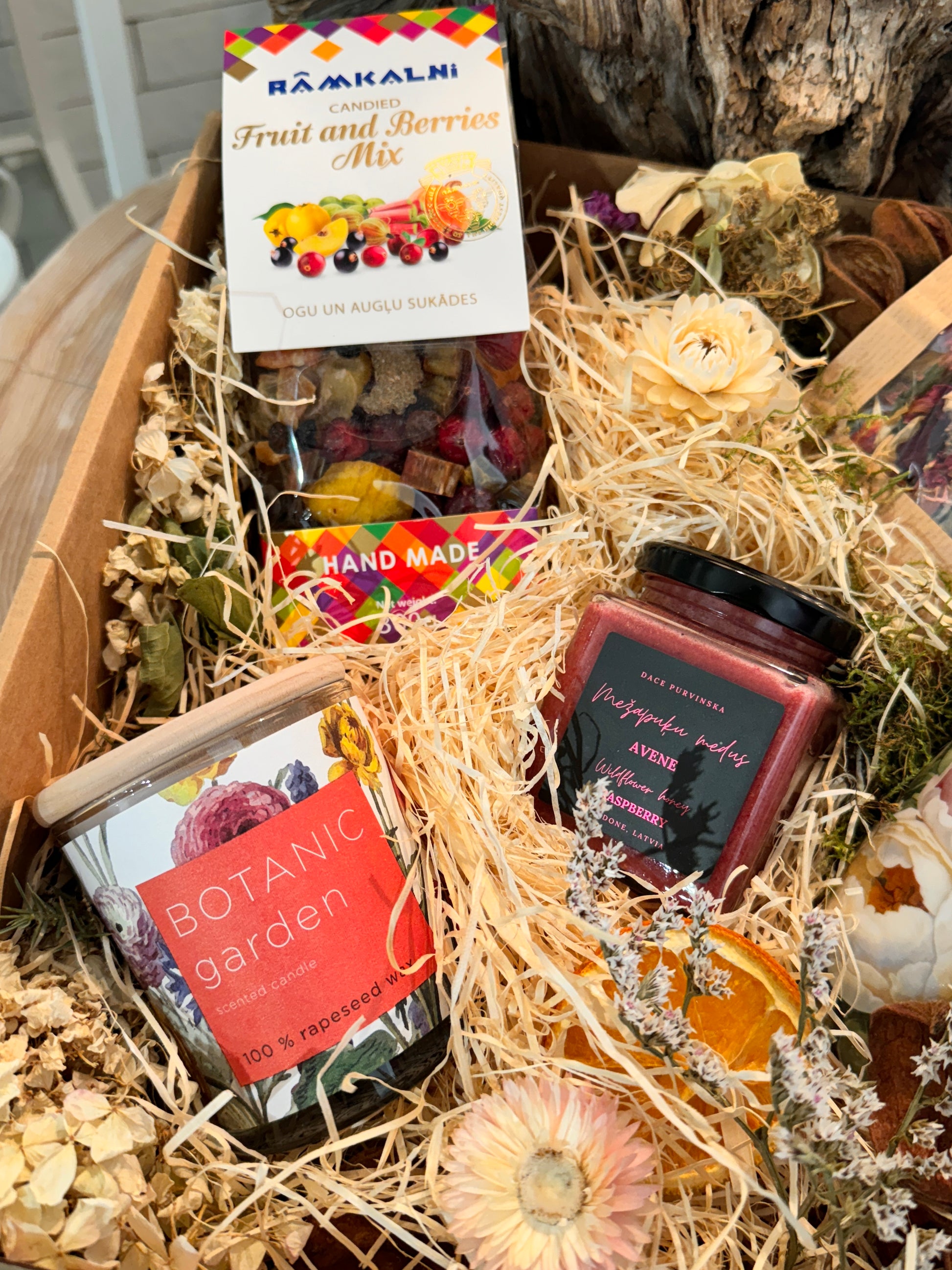 - Dāvanu komplekts noformēts dāvanu kastē un dekorēts ar sausajiem ziediem