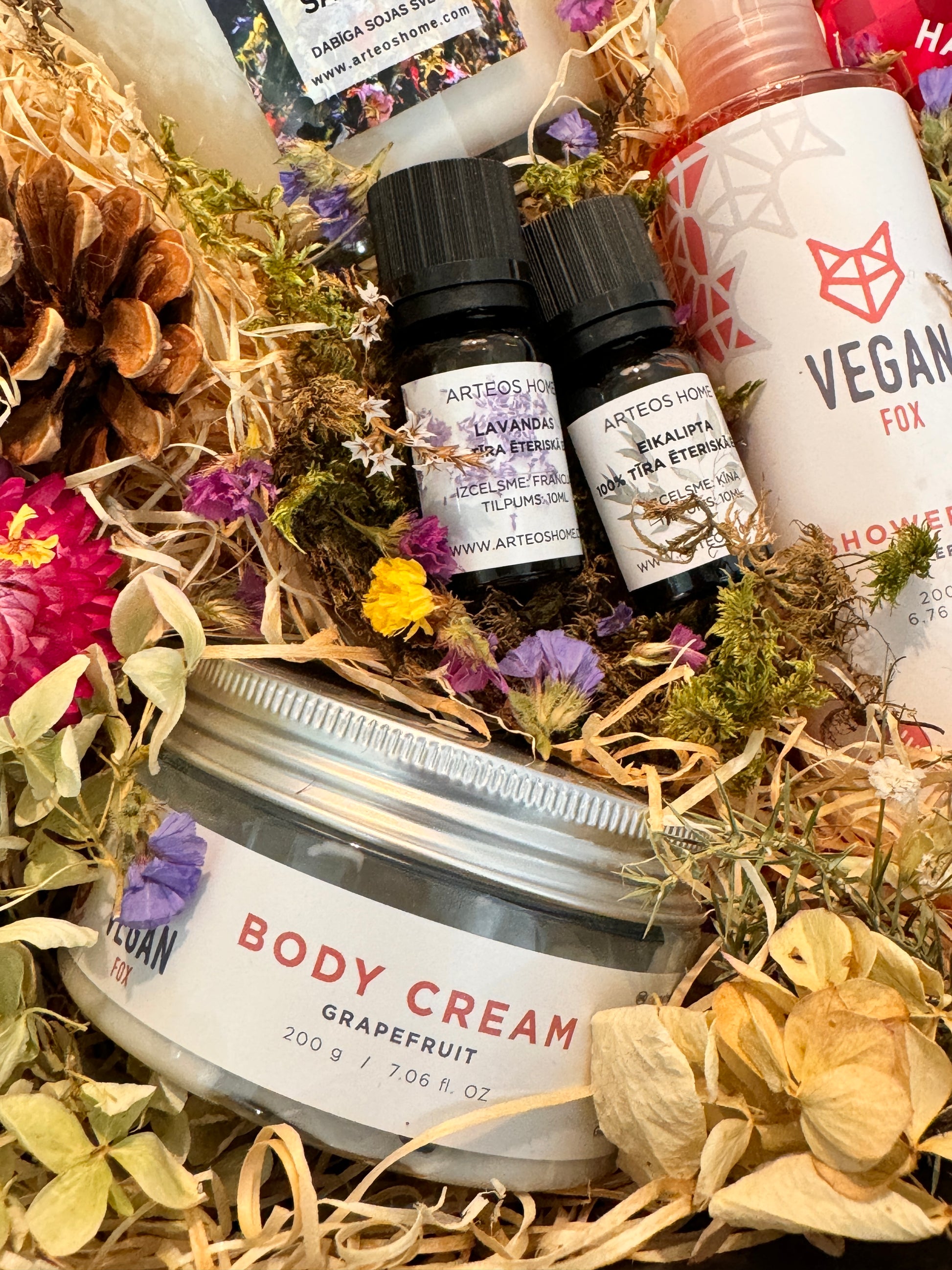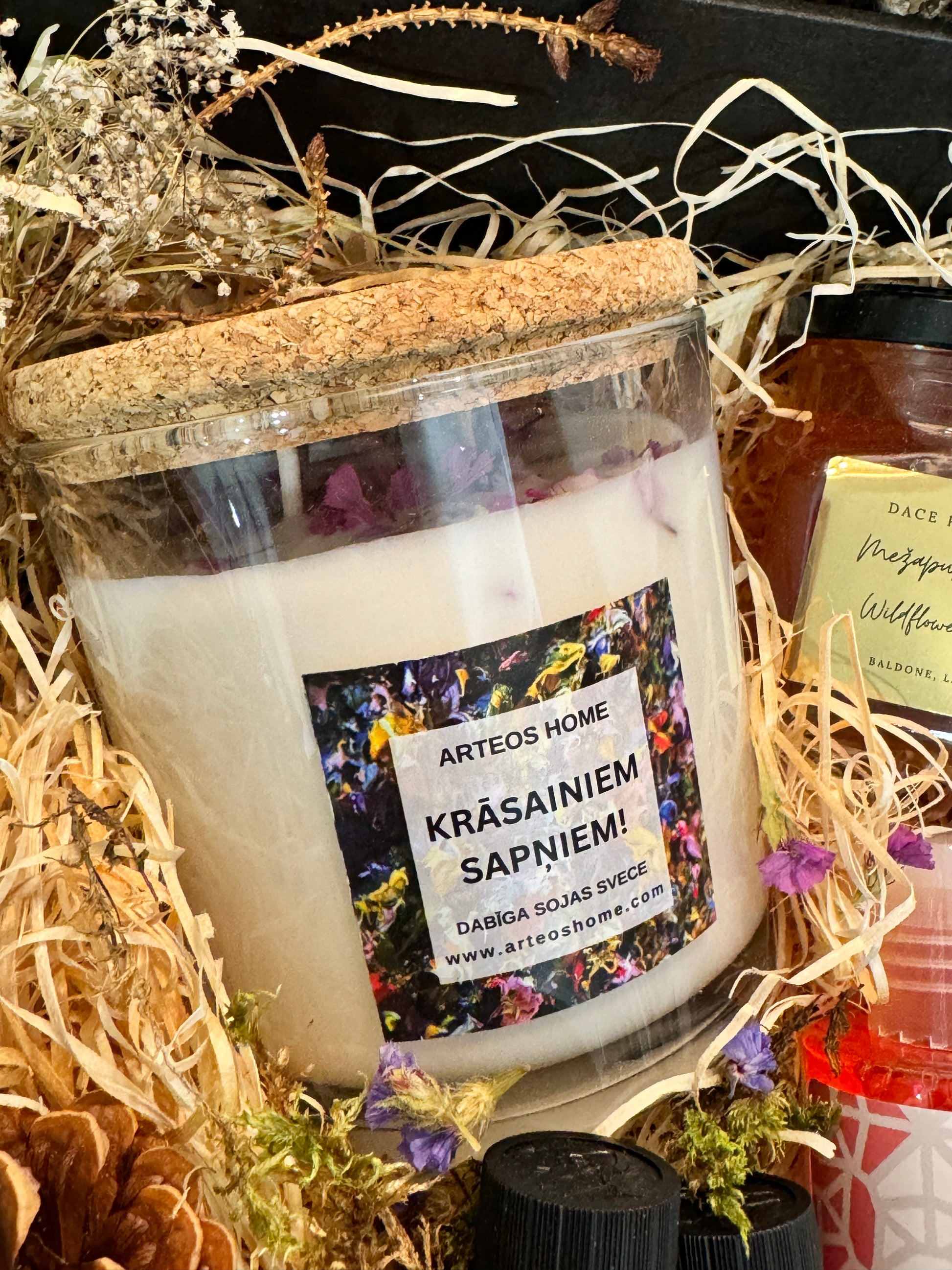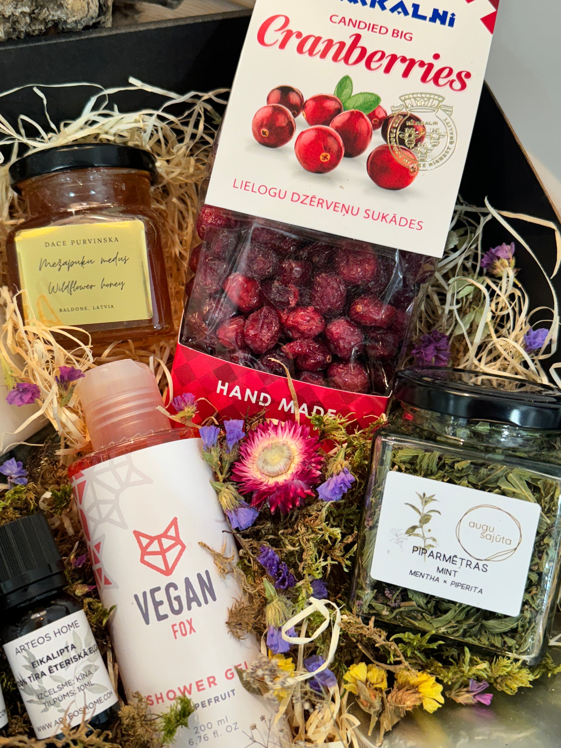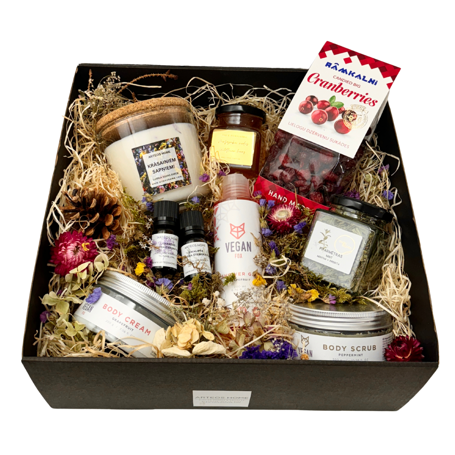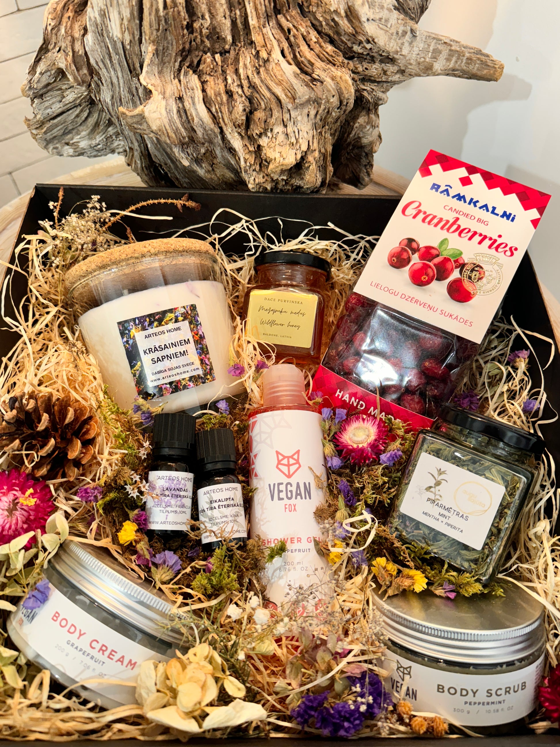 - Dāvanu komplekts noformēts dāvanu kastē un dekorēts ar sausajiem ziediem