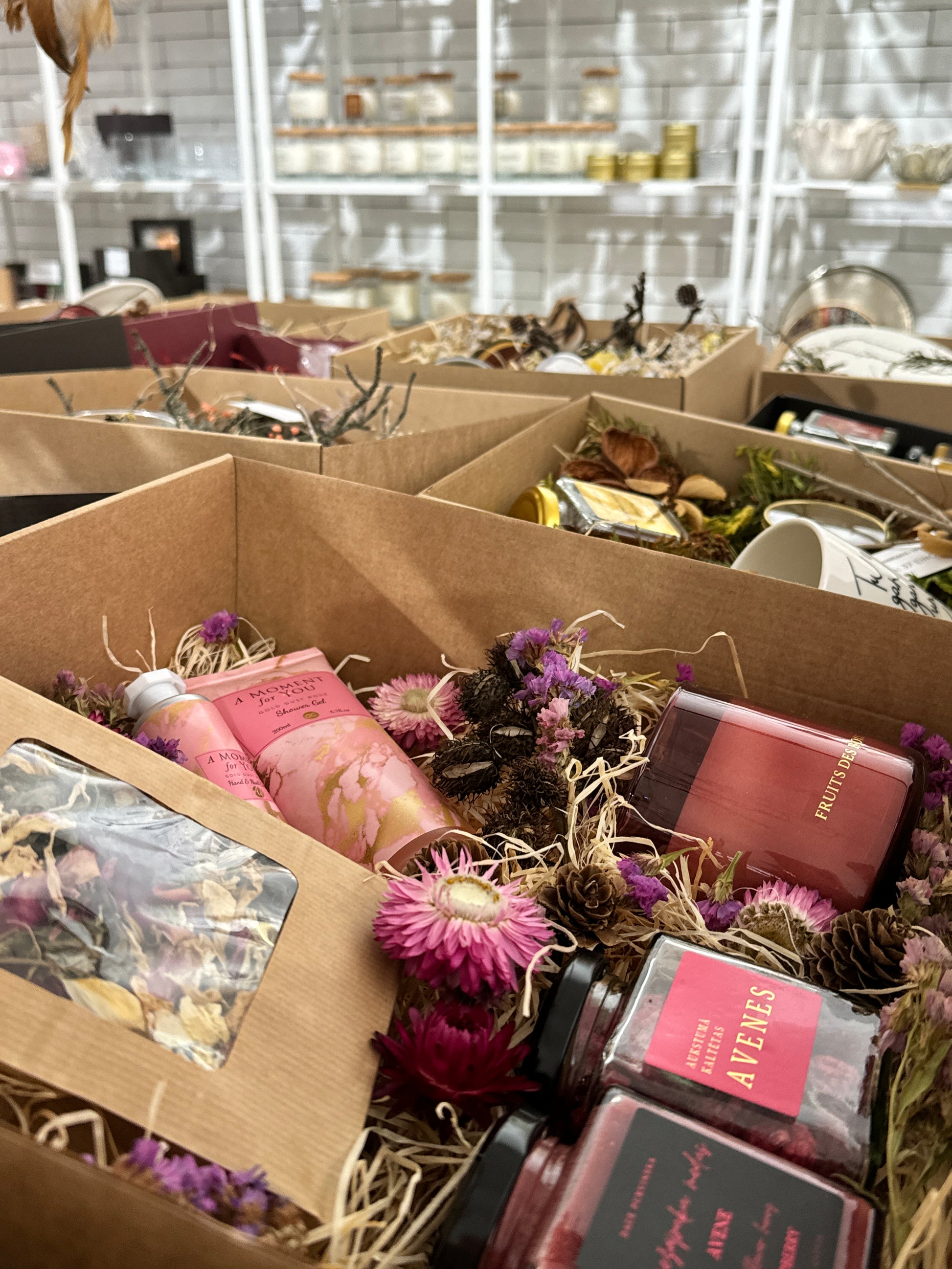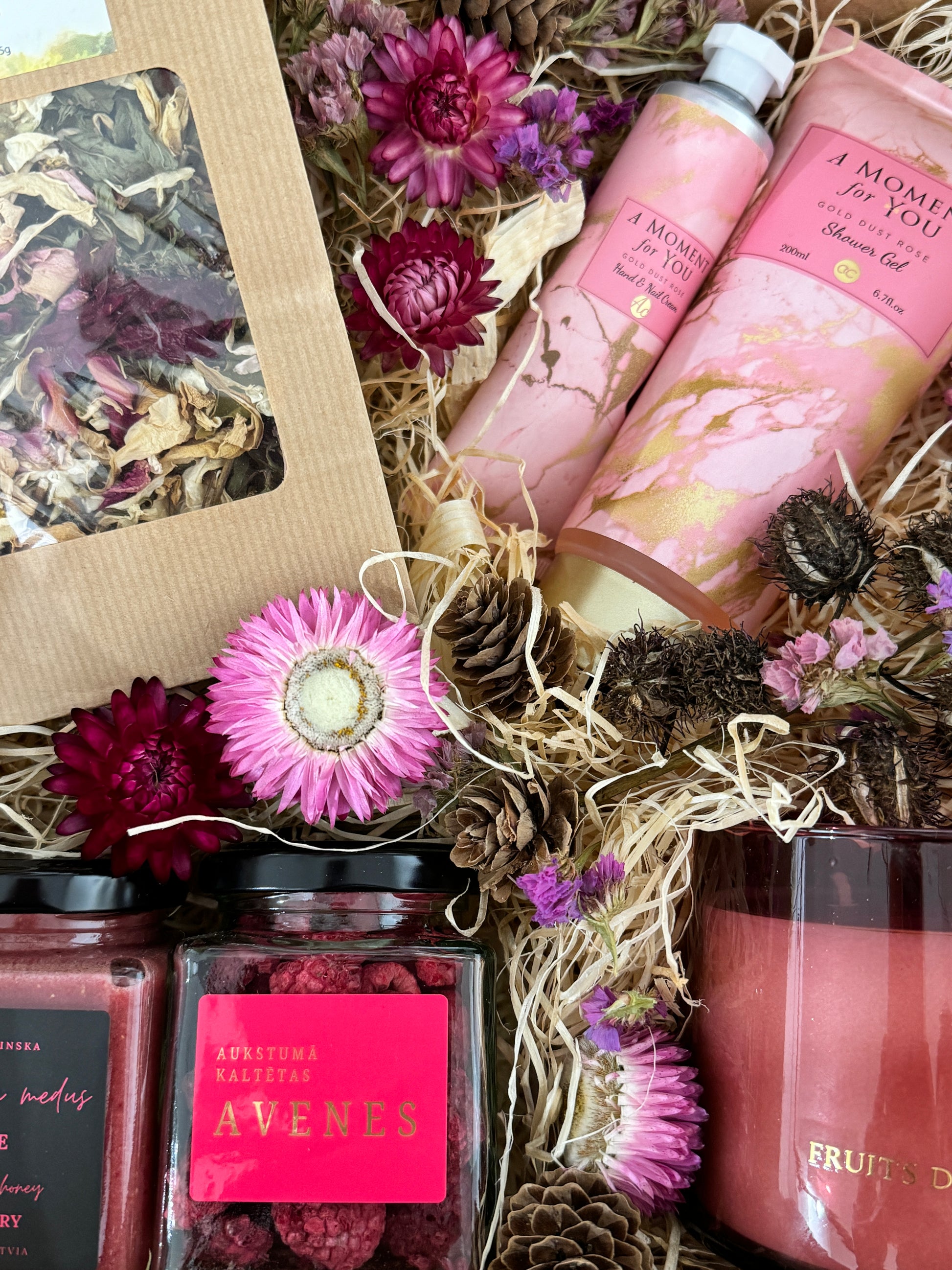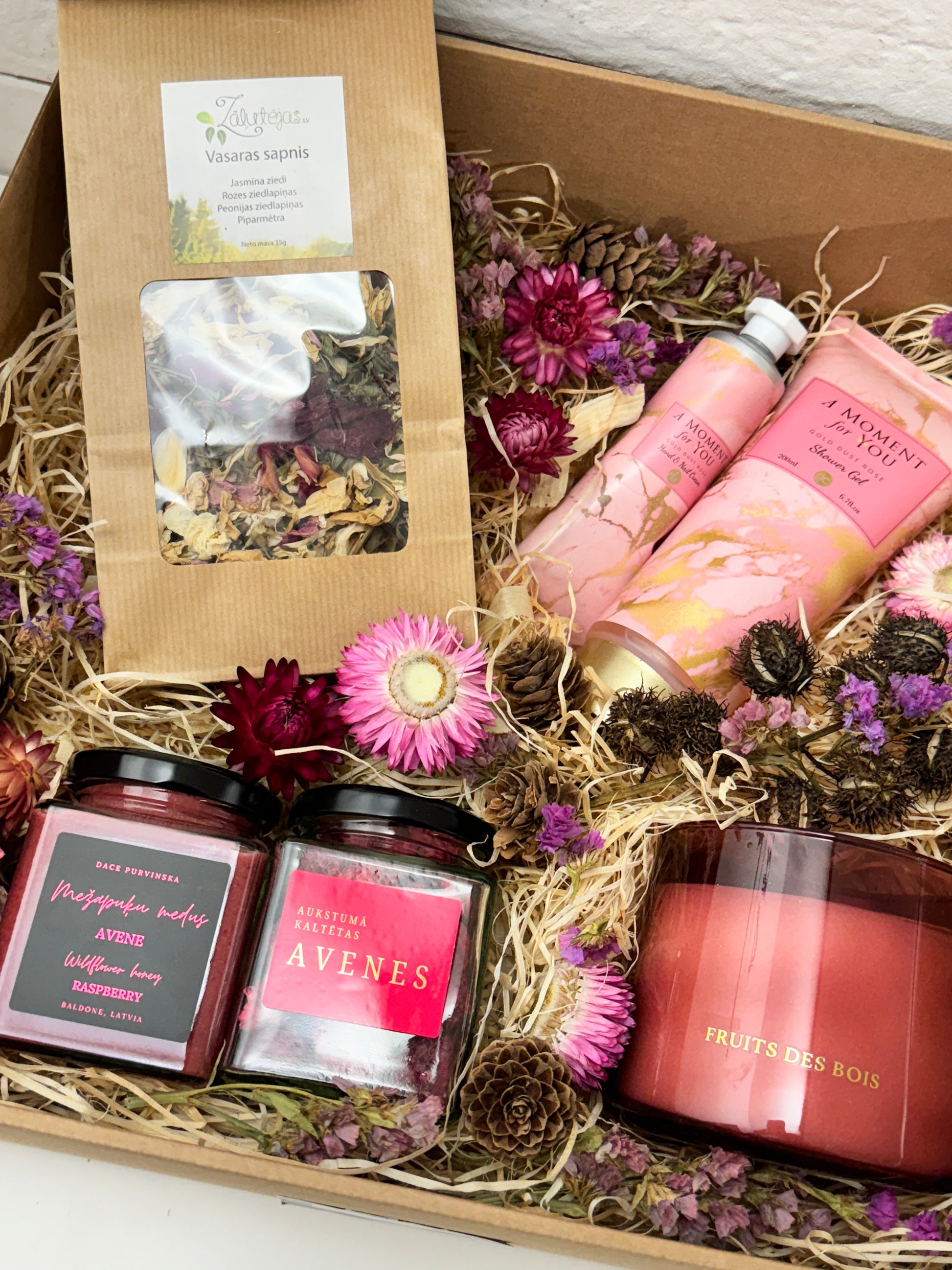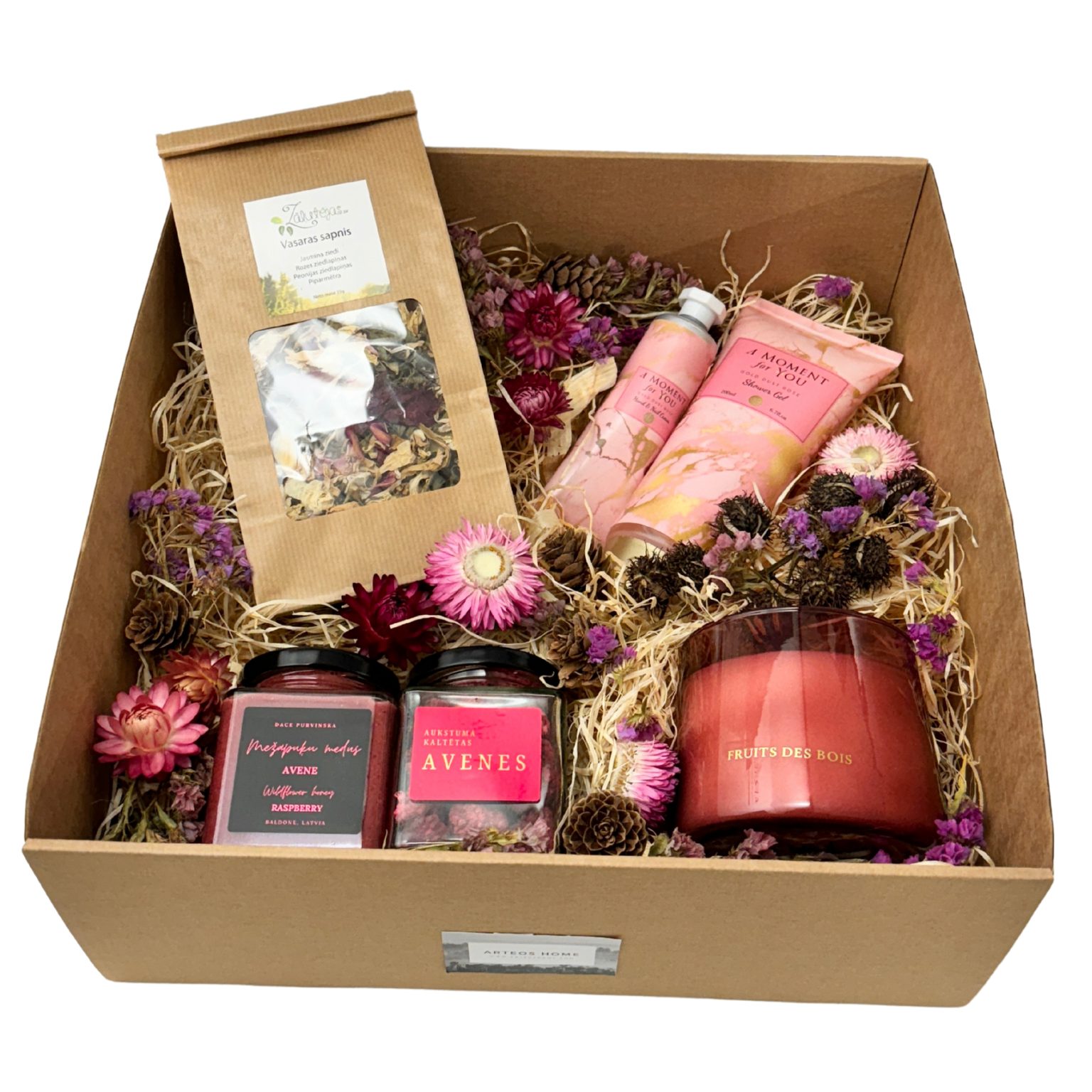 - Dāvanu komplekts dekorēts dāvanu kastē ar kaltētiem ziediem. Roku darbs.