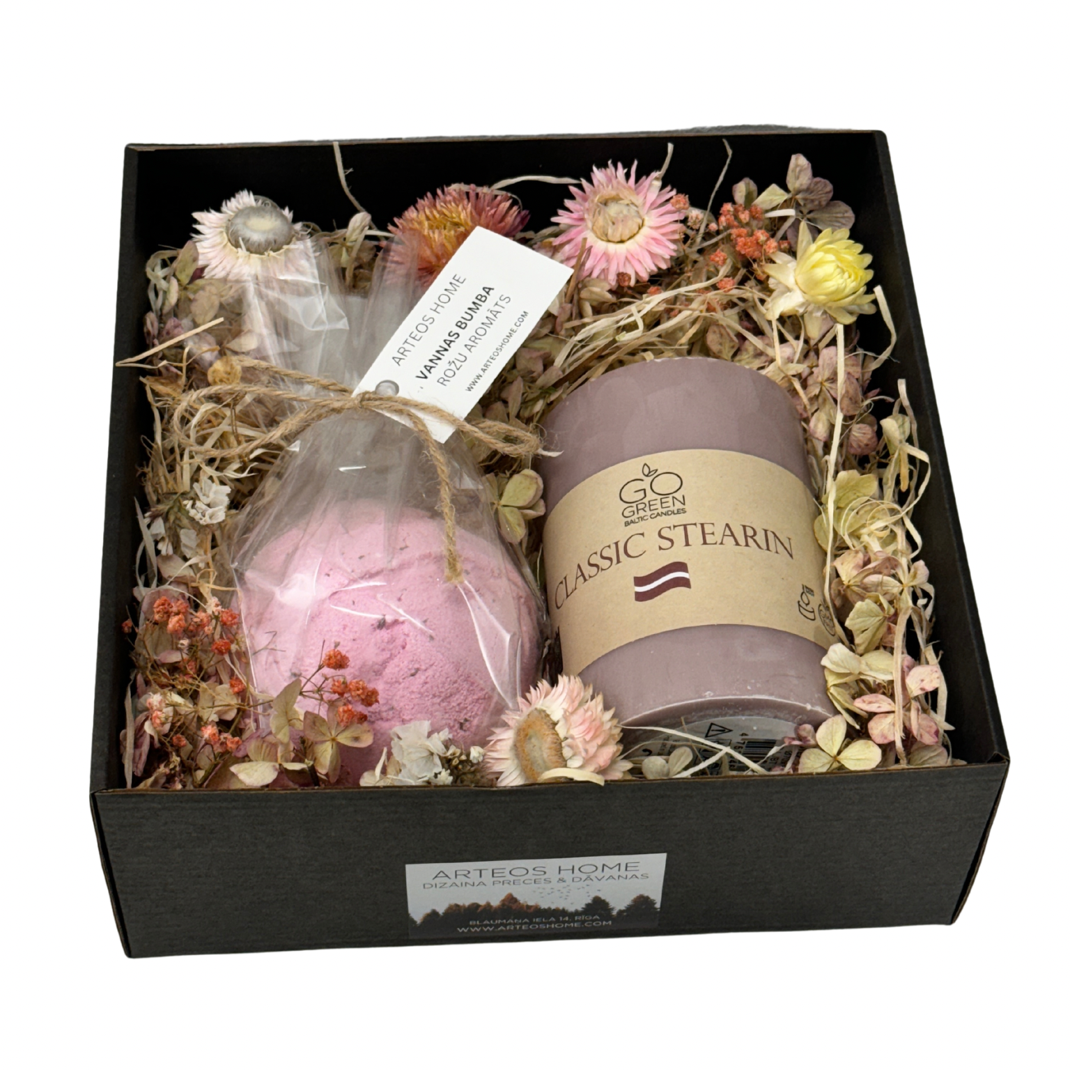 - Dāvanu komplekts dekorēts ar sausajiem ziediem