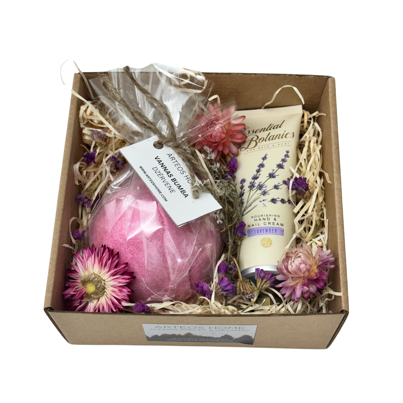 - Dāvanu komplekts noformēts dāvanu kastē un dekorēts ar sausajiem ziediem