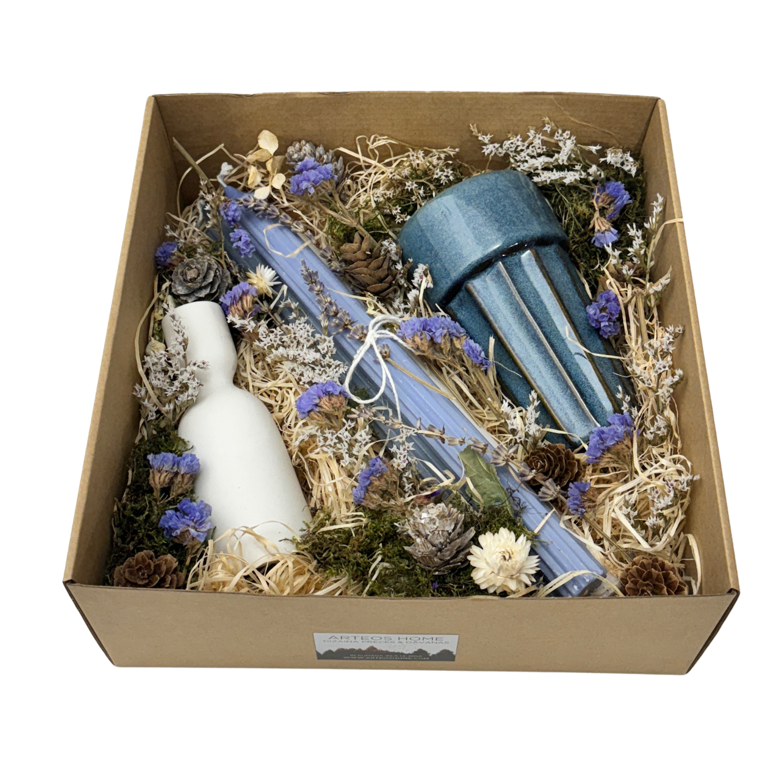 - Dāvanu komplekts noformēts dāvanu kastē un dekorēts ar sausajiem ziediem
