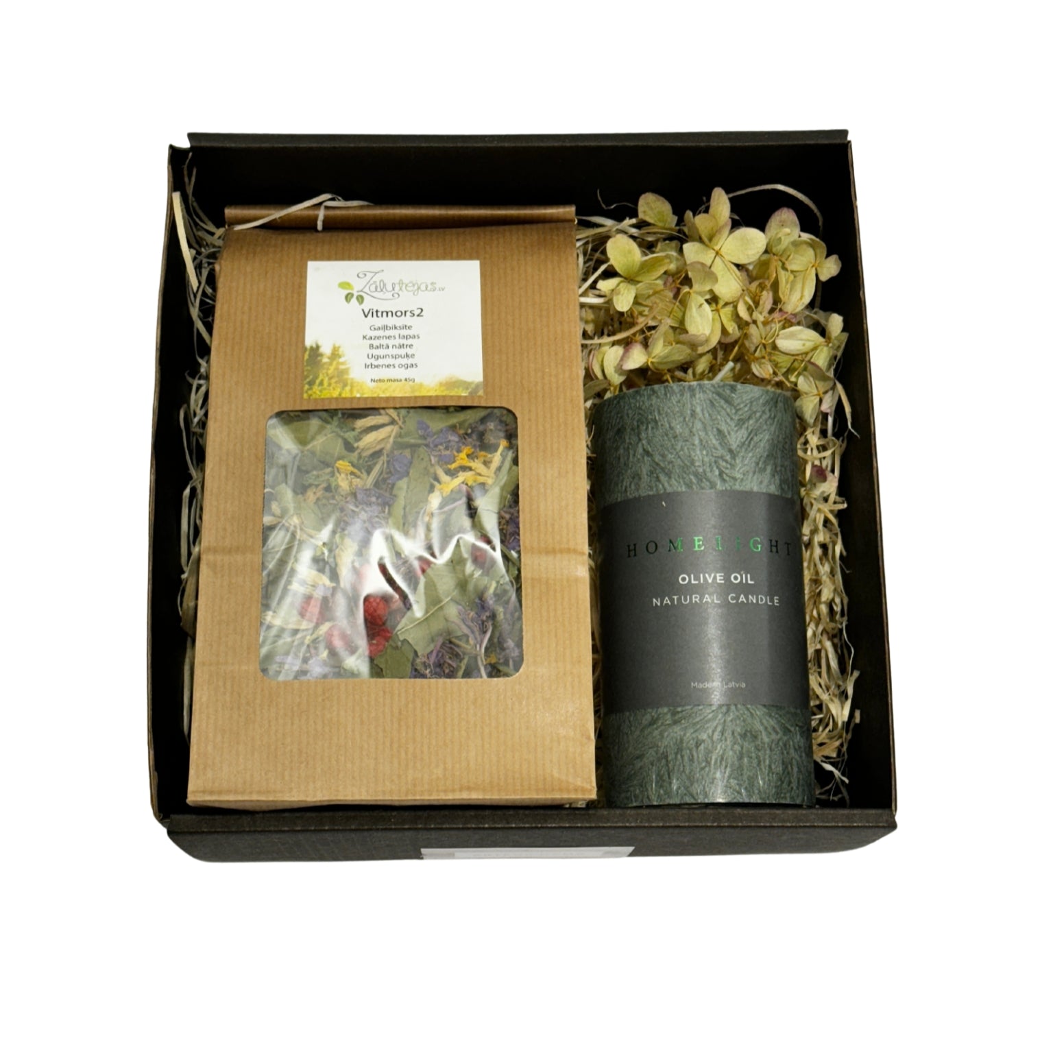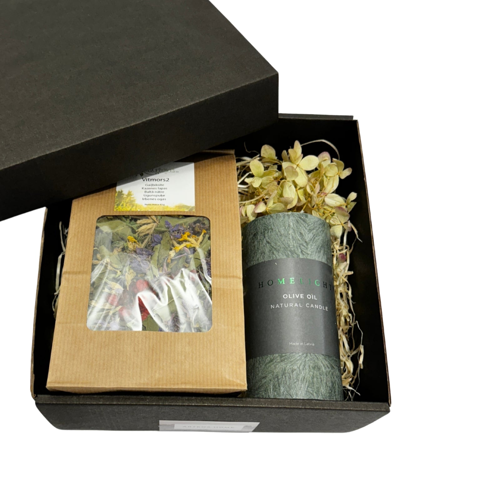 - Dāvanu komplektā iekļauta Latvijas zāļu tēja un Dobelē ražota eko olīveļļas svece