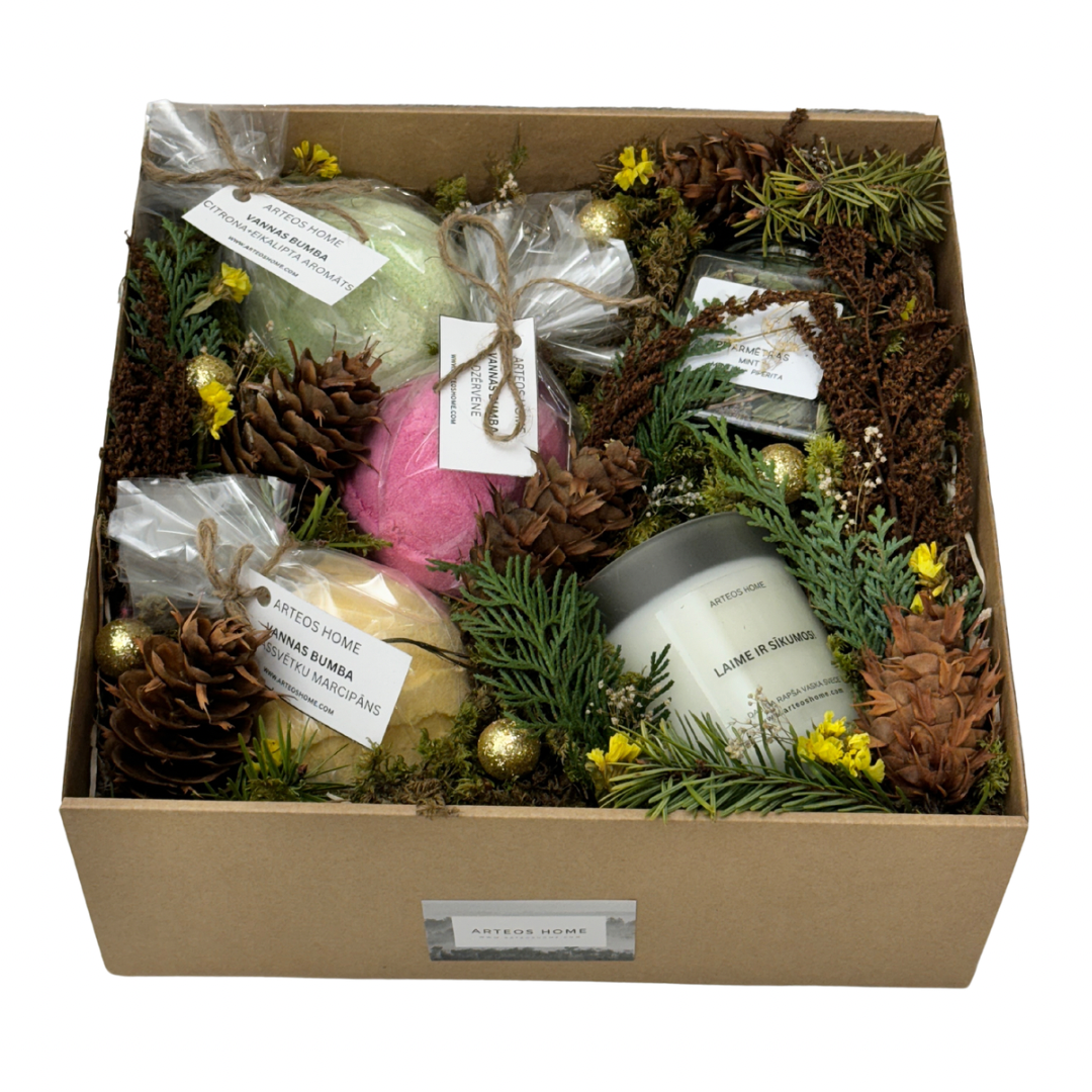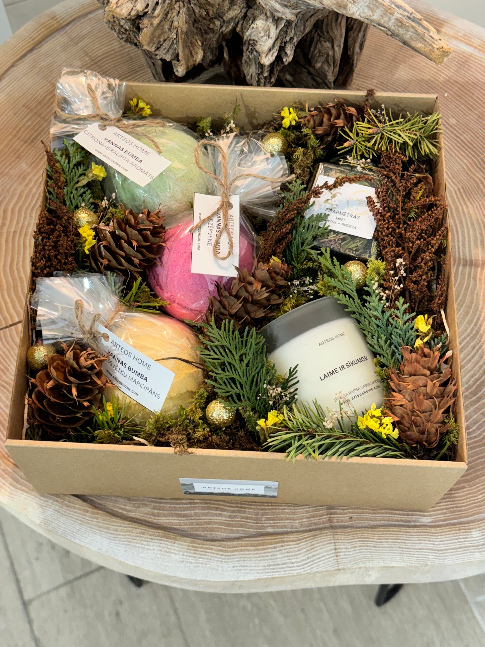 - Dāvanu komplekts dekorēts dāvanu kastē ar kaltētiem ziediem. Roku darbs.