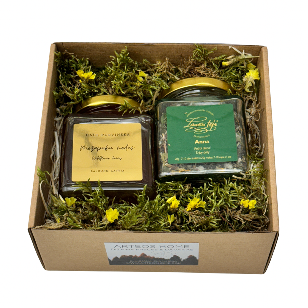 - Dāvanu komplekts dekorēts dāvanu kastē ar kaltētiem ziediem. Roku darbs.