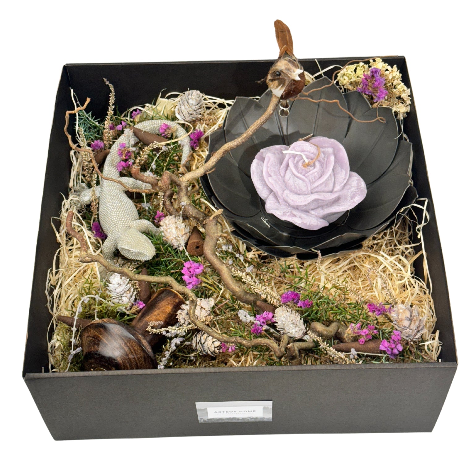 - Dāvanu komplekts iesaiņots dāvanu kastē, dekorējot ar Latvijā audzētiem, kaltētiem ziediem.