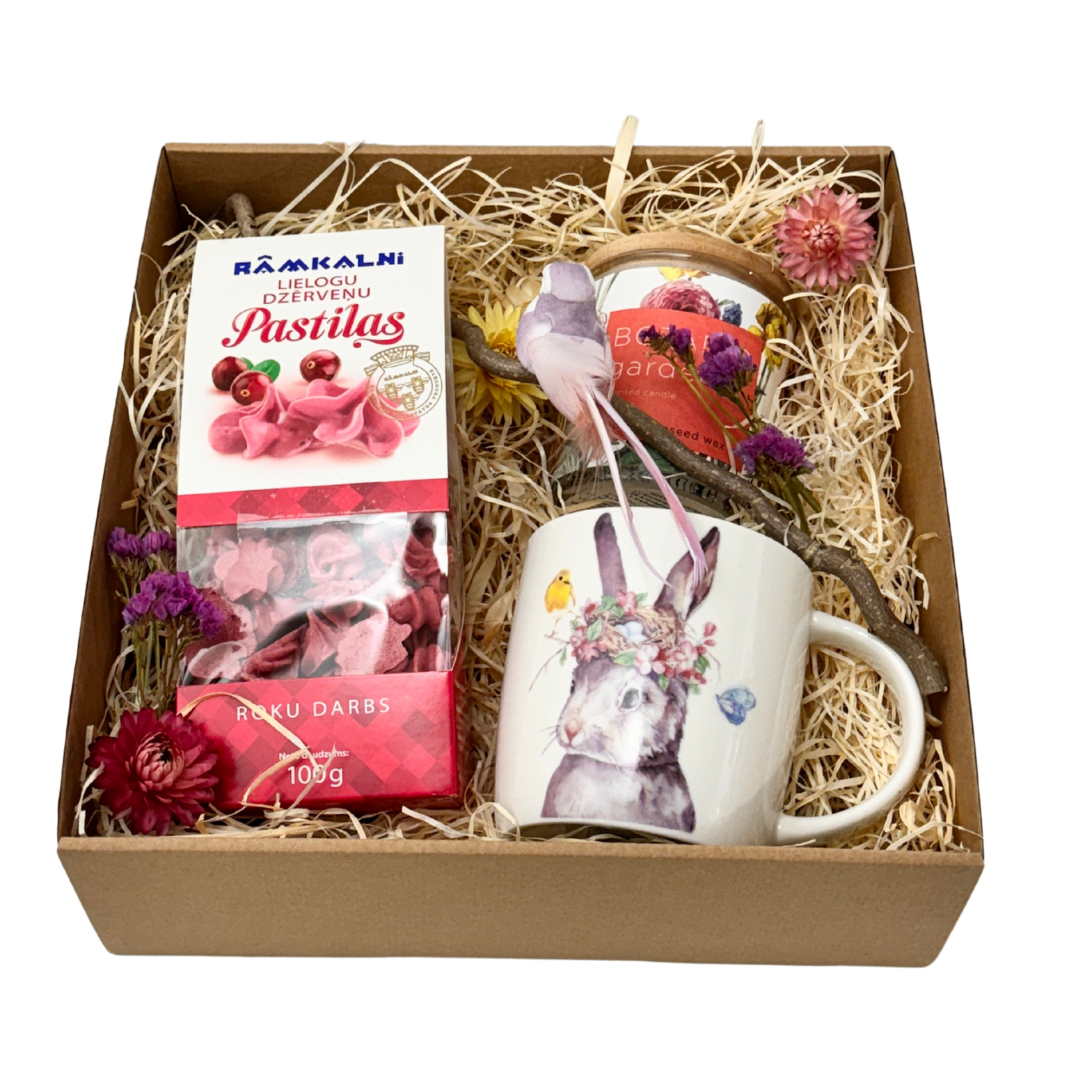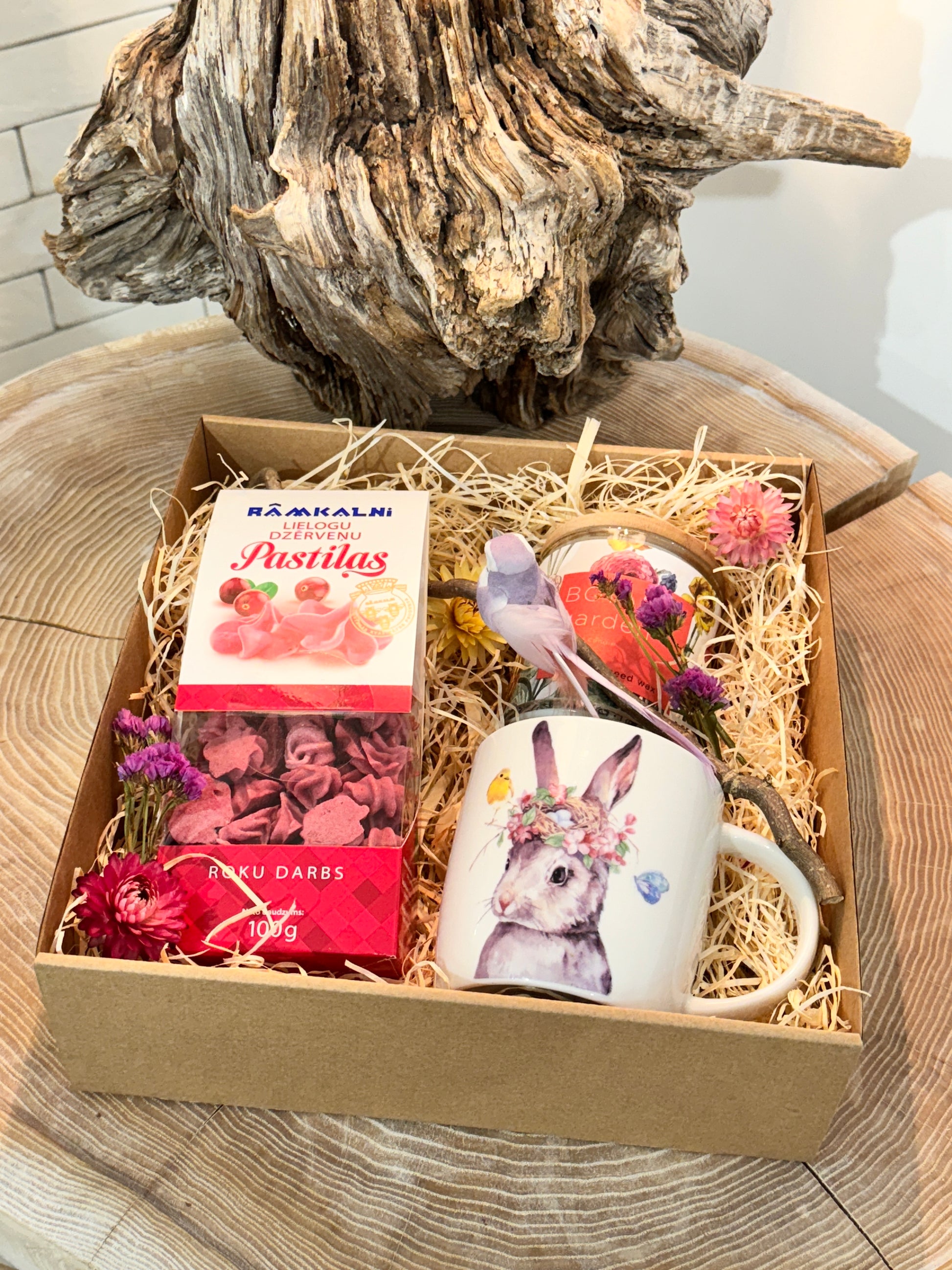 - Dāvanu komplekts noformēts dāvanu kastē un dekorēts ar sausajiem ziediem