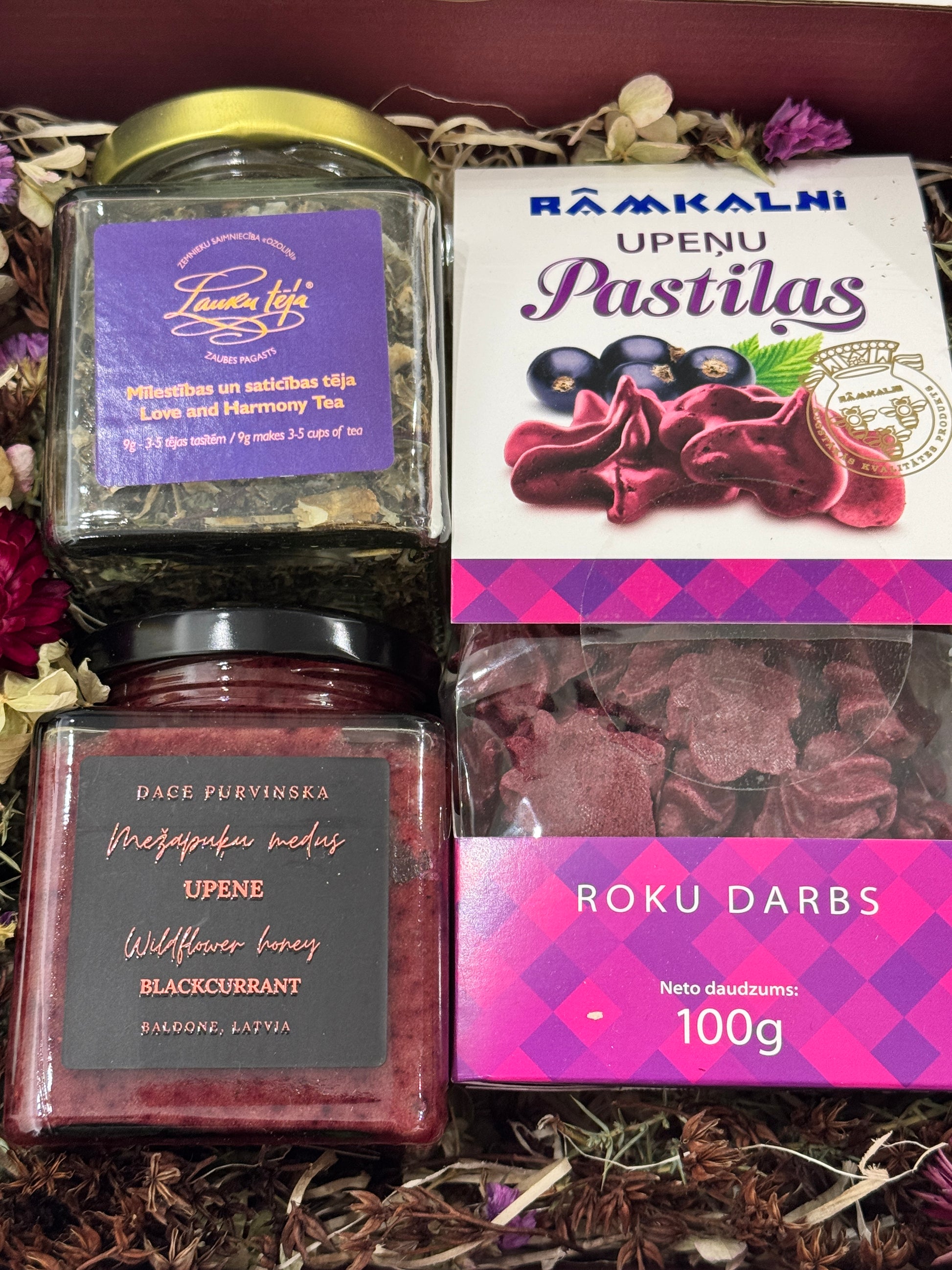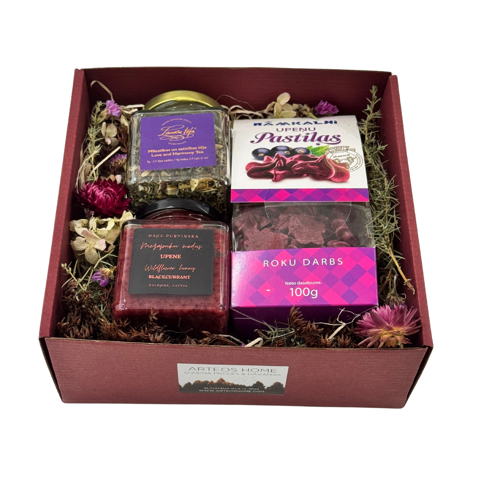 - Dāvanu komplekts dekorēts dāvanu kastē ar sausajiem ziediem un pa virsu uzsietu banti