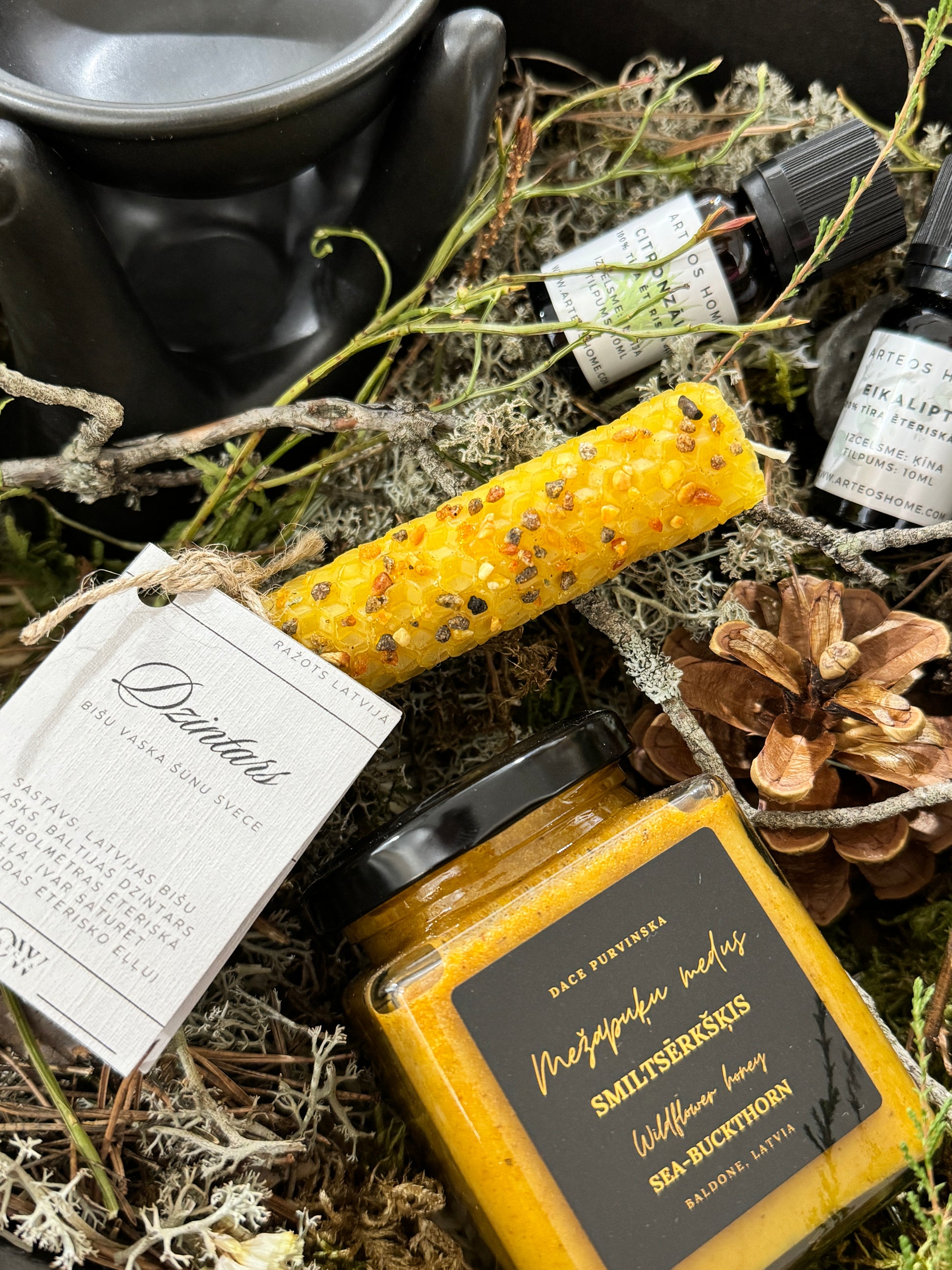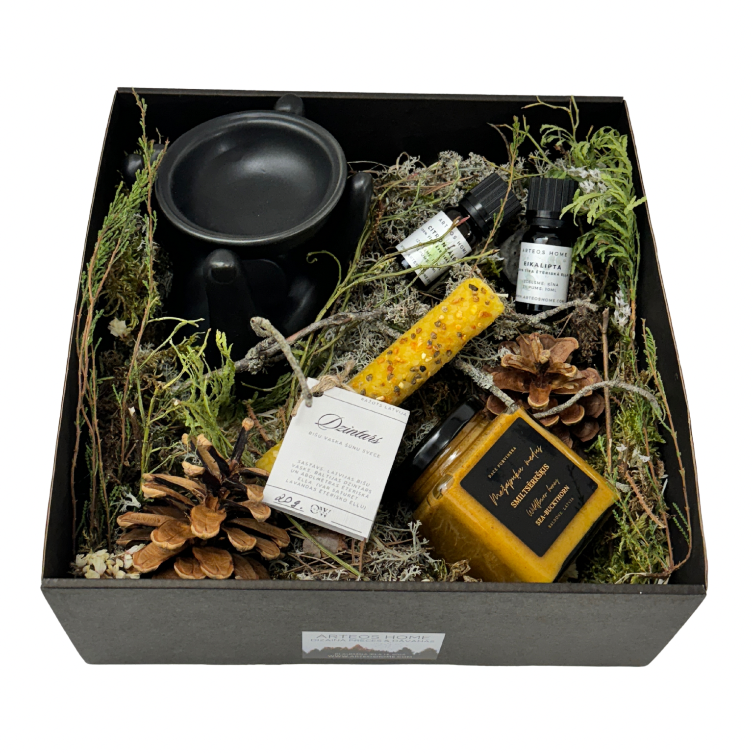 - Dāvanu komplekts dekorēts dāvanu kastē ar kaltētiem ziediem. Roku darbs.