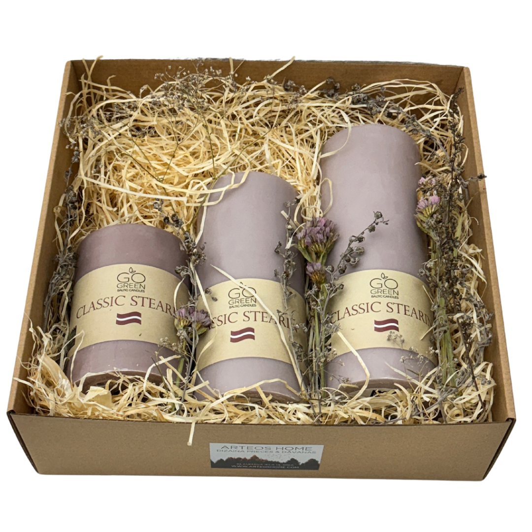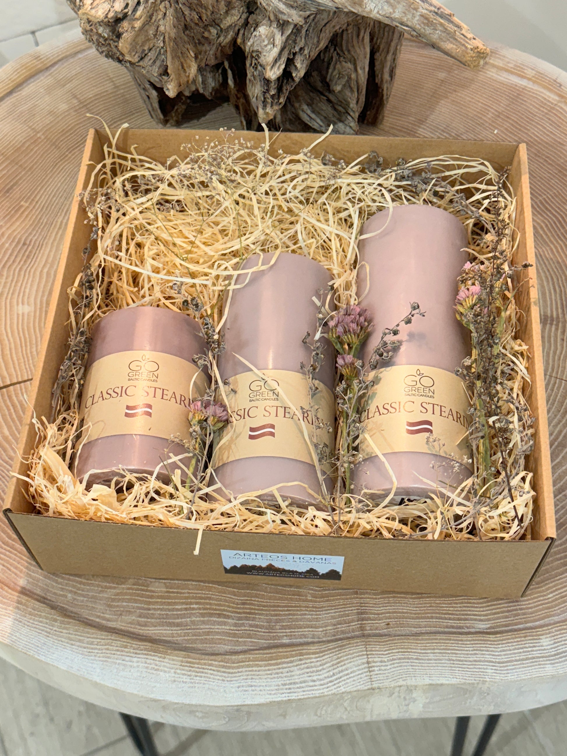 - Dāvanu komplekts dekorēts dāvanu kastē ar kaltētiem ziediem. Roku darbs.
