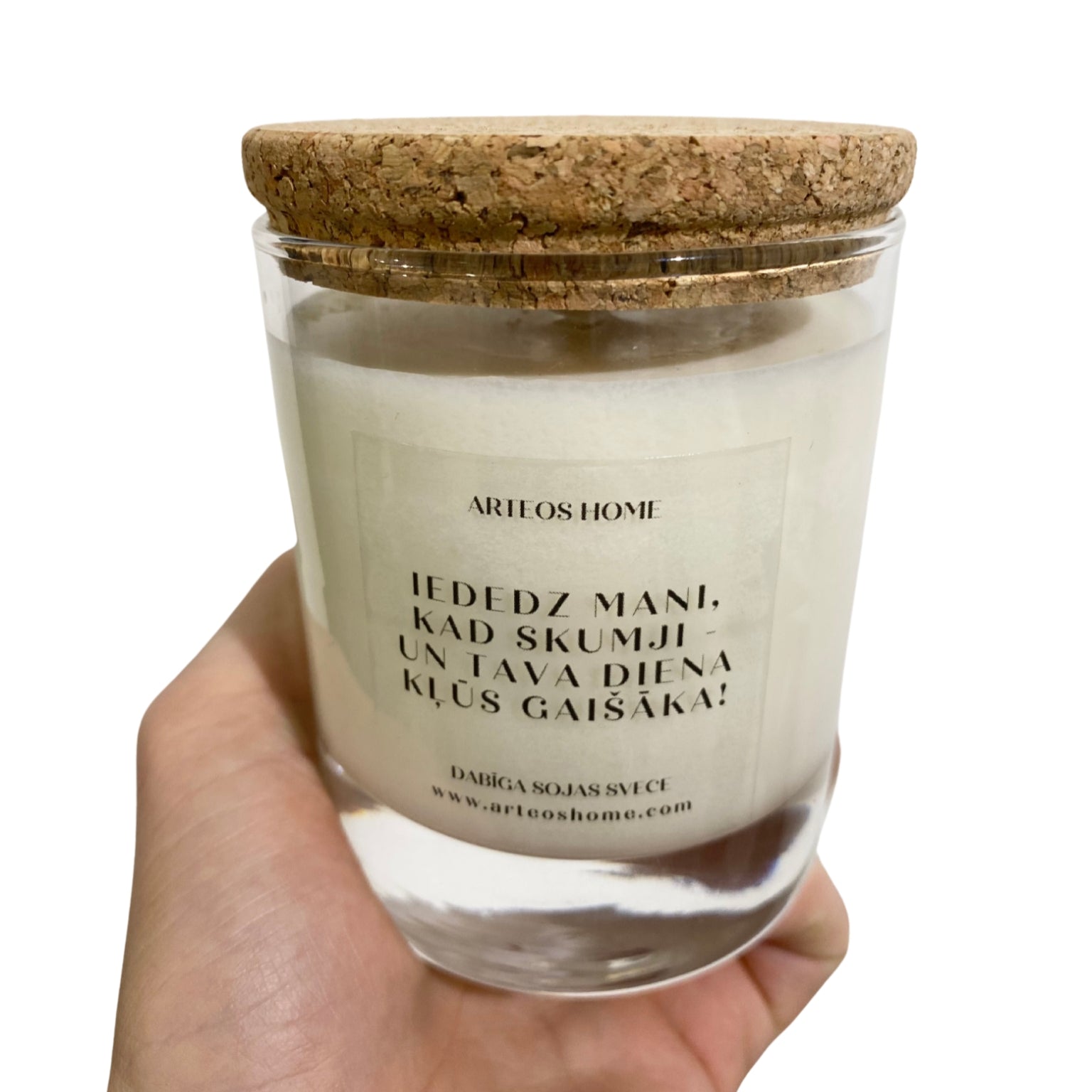 - Sojas vasks ir 100% dabīgs, atjaunojams un videi draudzīgs izejmateriāls. Degot šī svece neizdalīs kancerogēnās vielas un degs līdz pat 50% ilgāk, kā, piemēram, parafīna svece. Šīs sveces ir aromātiskas - ar medus + sandalkoka aromātu vai lavanda + pačūlija. Svece ir dabīga, ar kokvilnas dakti.